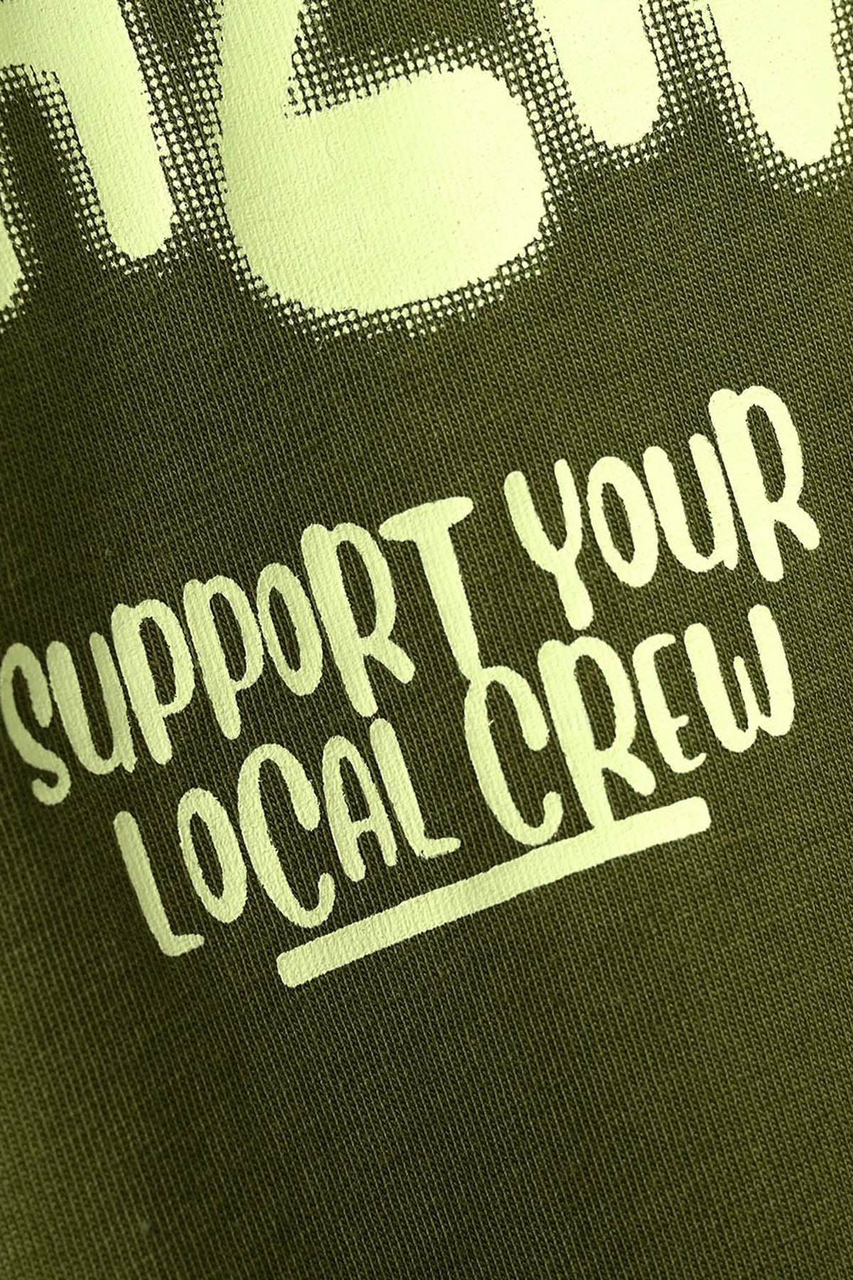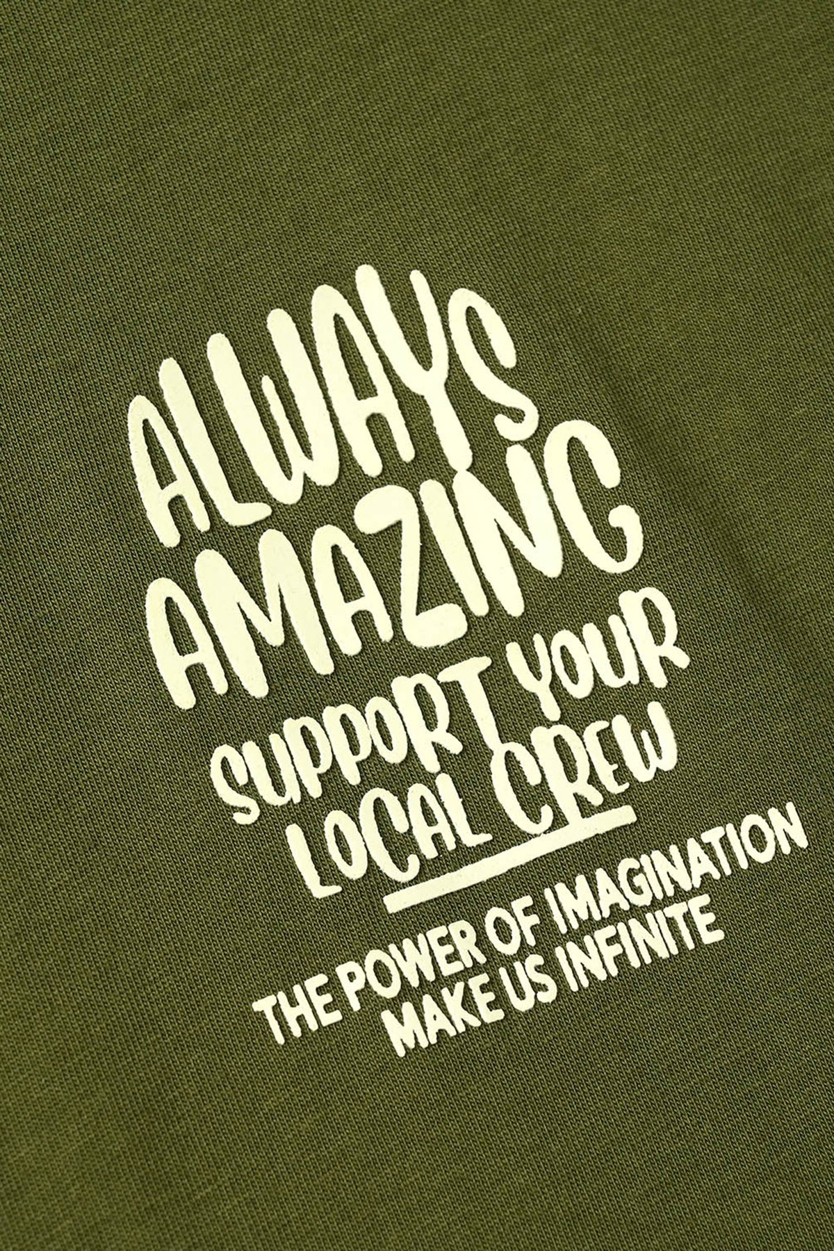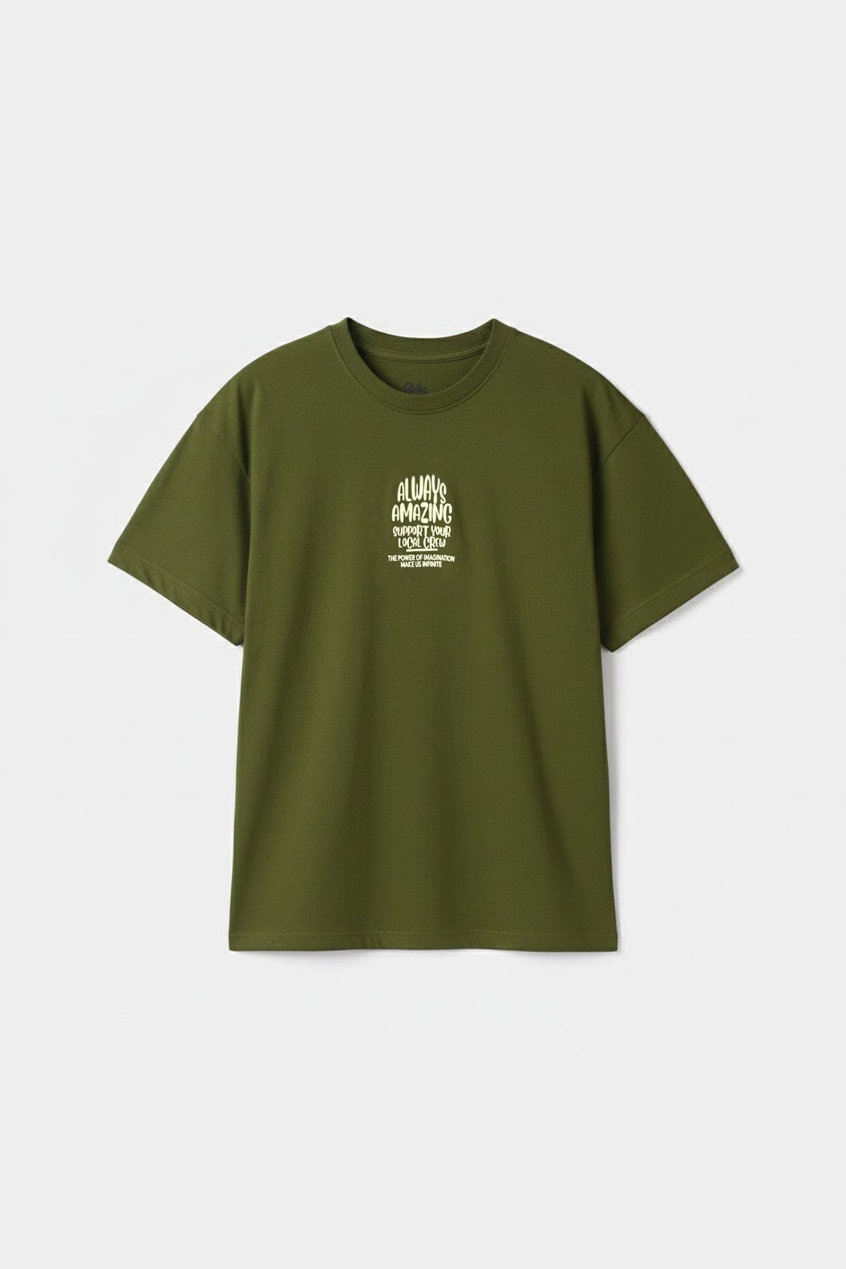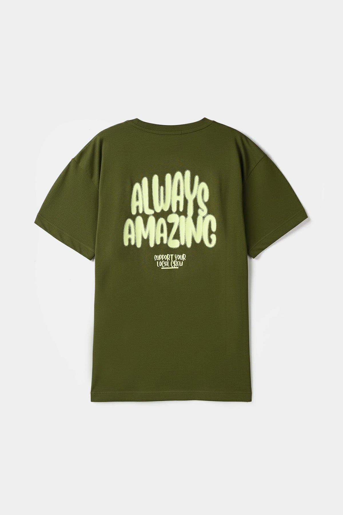 Boys olive-green printed T-shirt featuring a round neck and half sleeves for a casual and comfortable everyday look.
