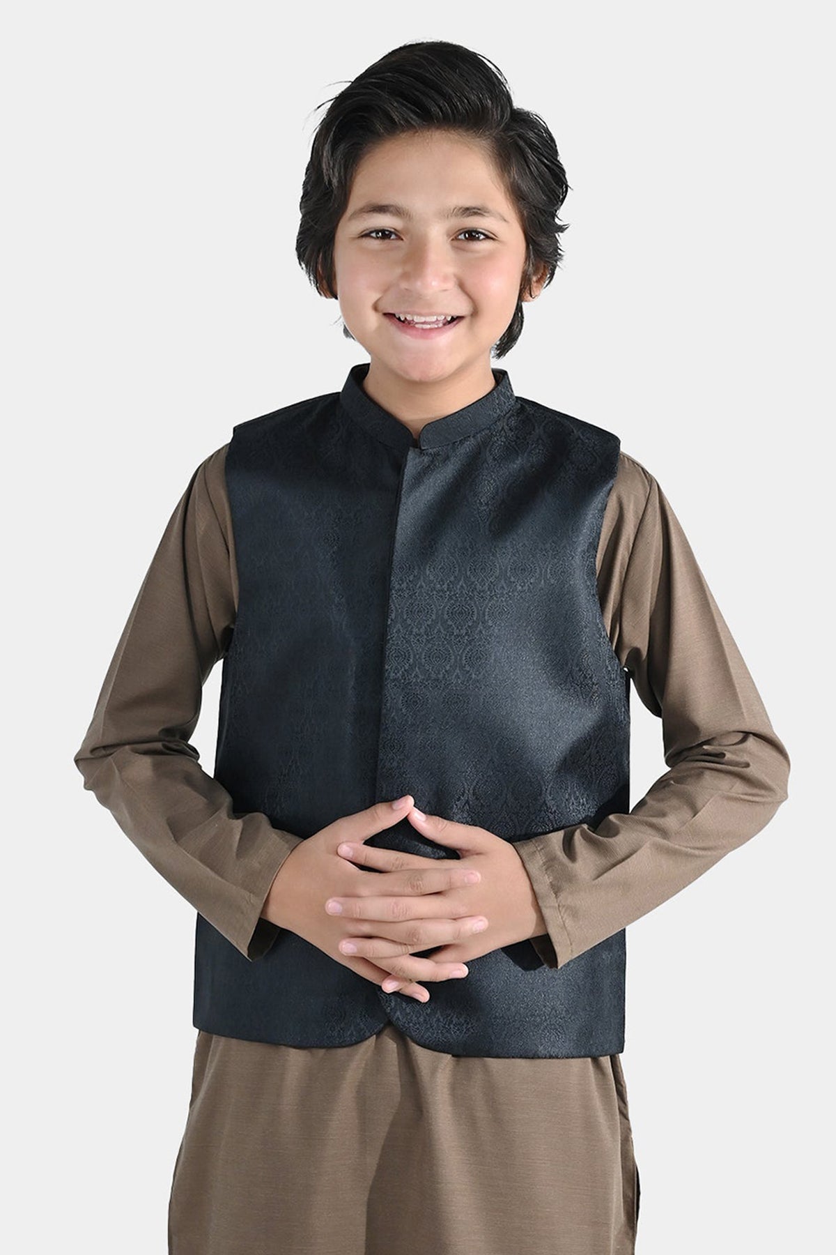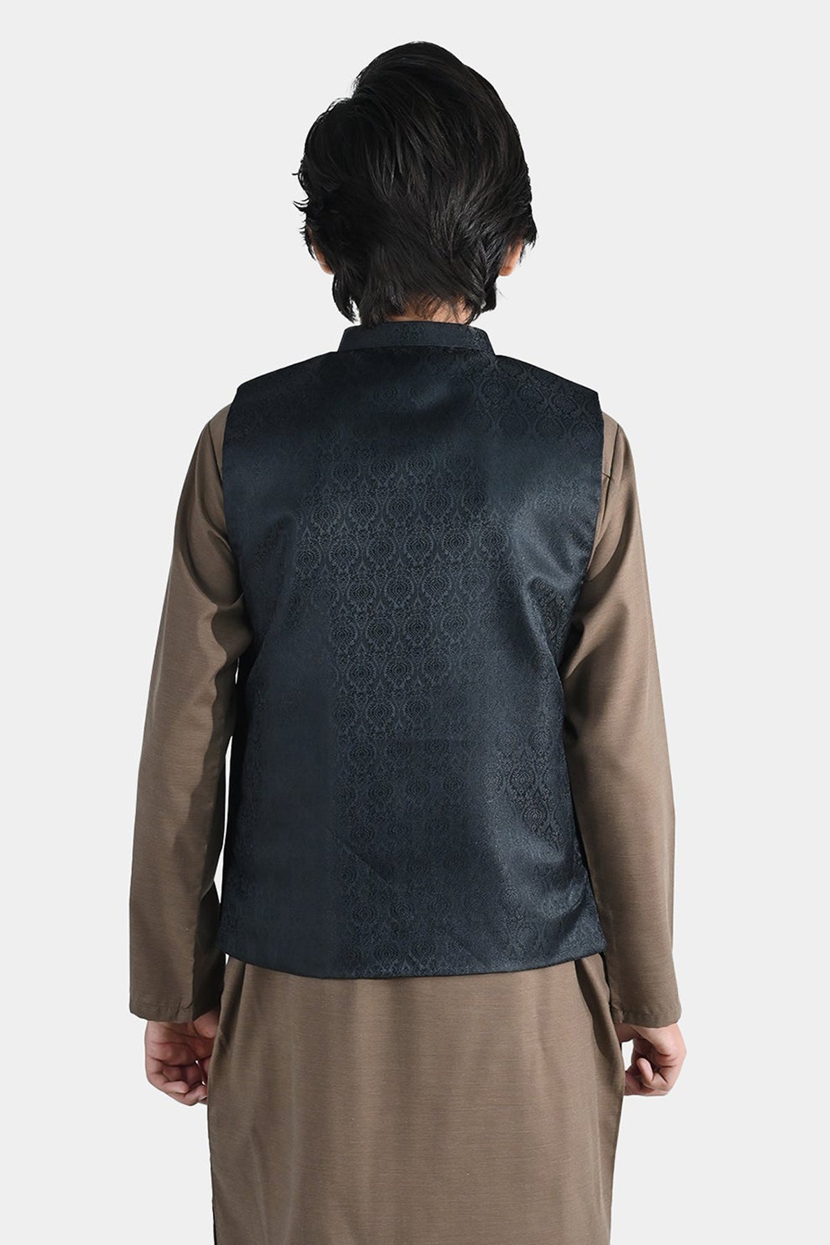 Boys' poly viscose waistcoat in black features a classic fit and stylish design, perfect for layering over a kurta/kameez shalwar for formal or festive occasions.