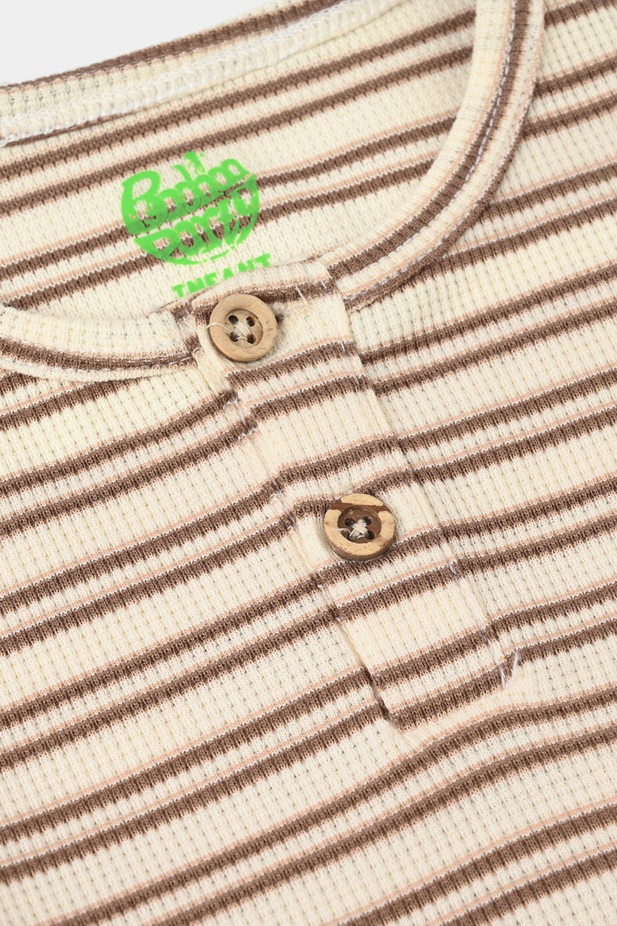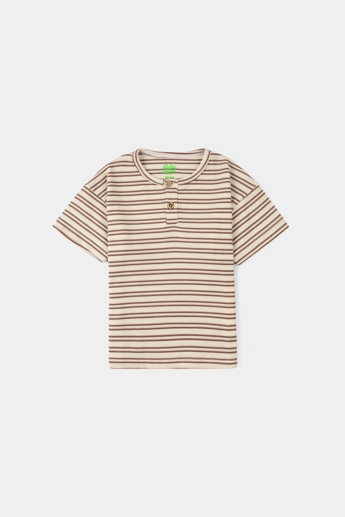 Infant boys’ yarn-dyed round neck T-shirt in brown, featuring a striped pattern and half sleeves.