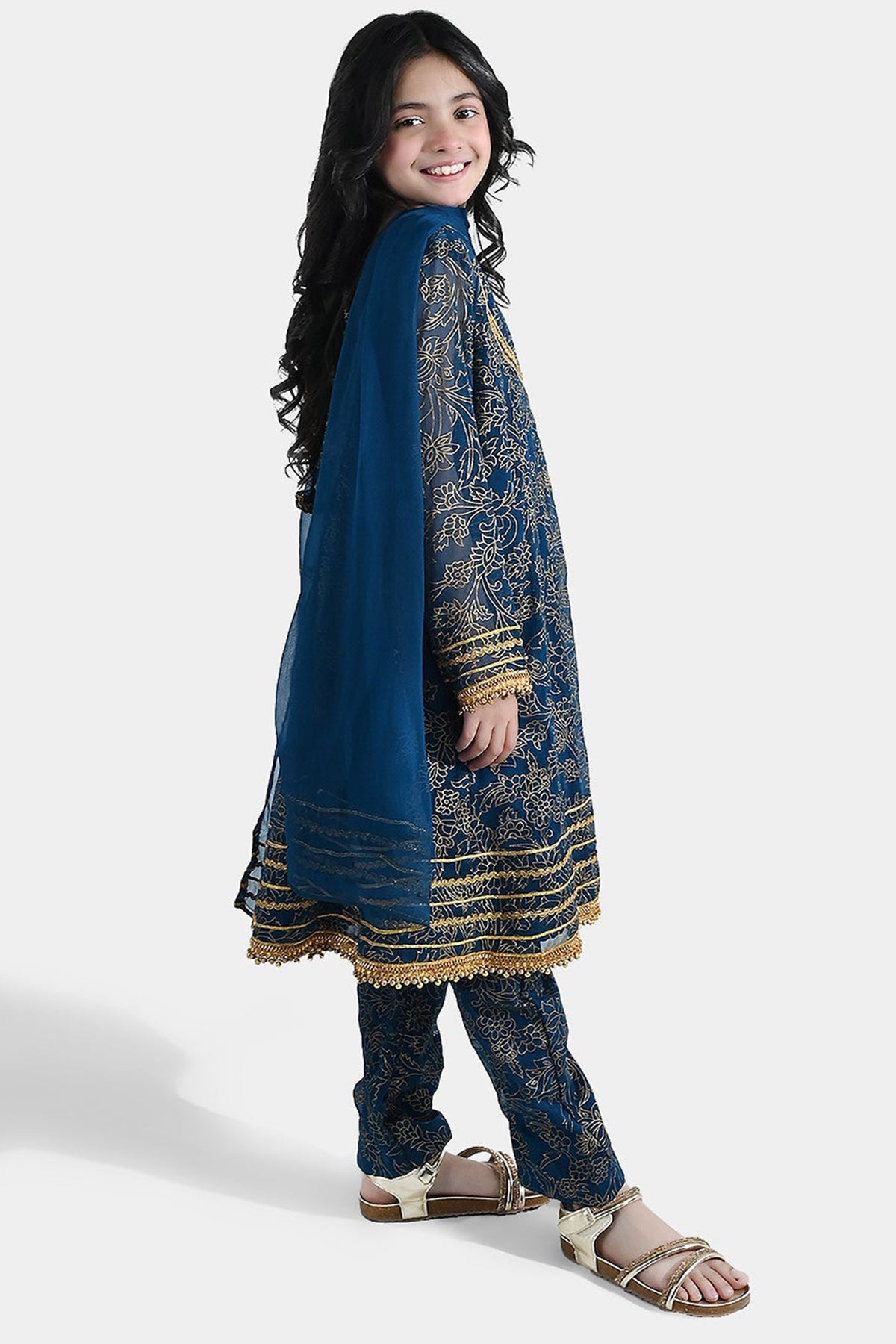 Girls' 3-piece set Zarmeena in bright teal features lace detailing, full sleeves, a matching dupatta, and trousers for a complete festive look.