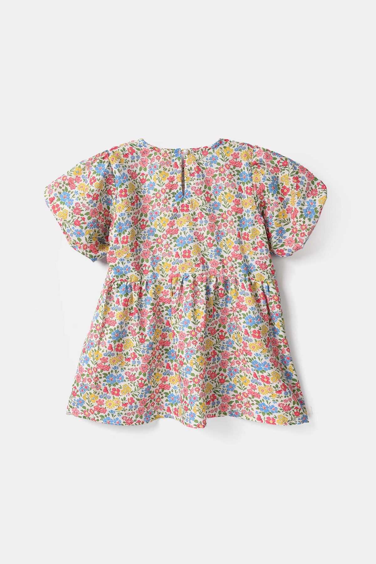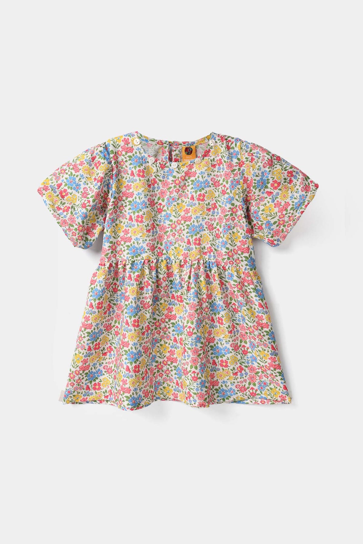 Girls co-ord set featuring a tropical floral print, round-neck frock-style top with half sleeves, paired with matching bottoms for a cute and comfortable everyday look.