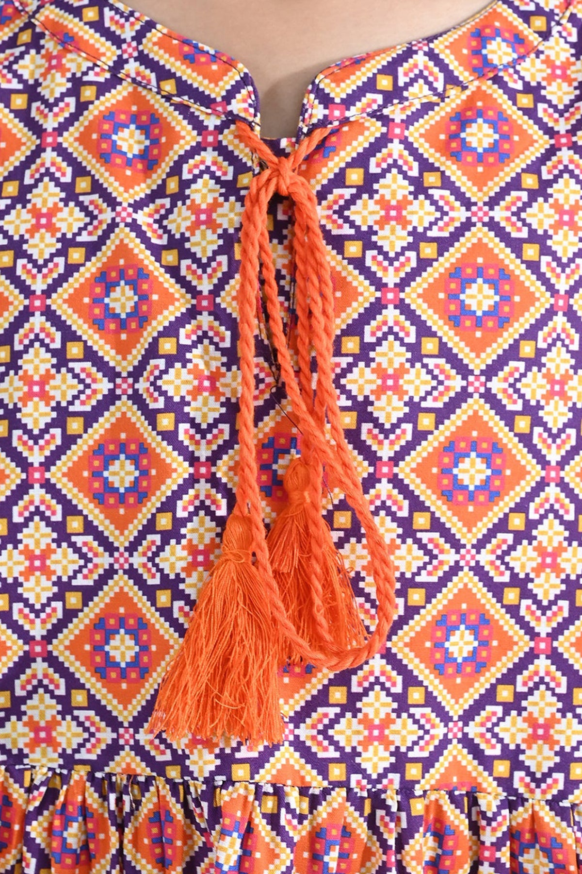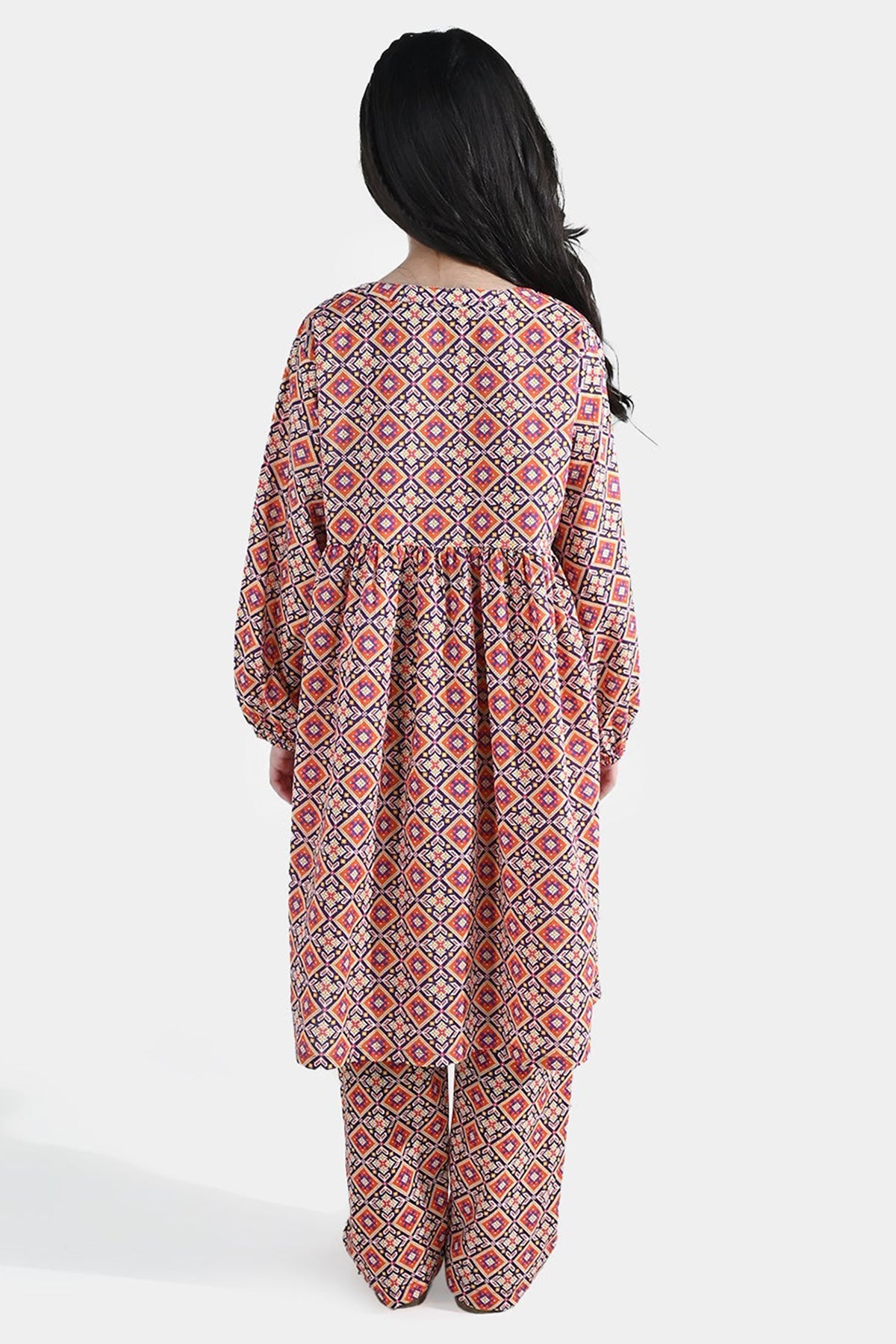 Girls’ cotton printed 2-piece set in multi, featuring a dori-neck frock, full sleeves with elastic hem, and matching bottoms.