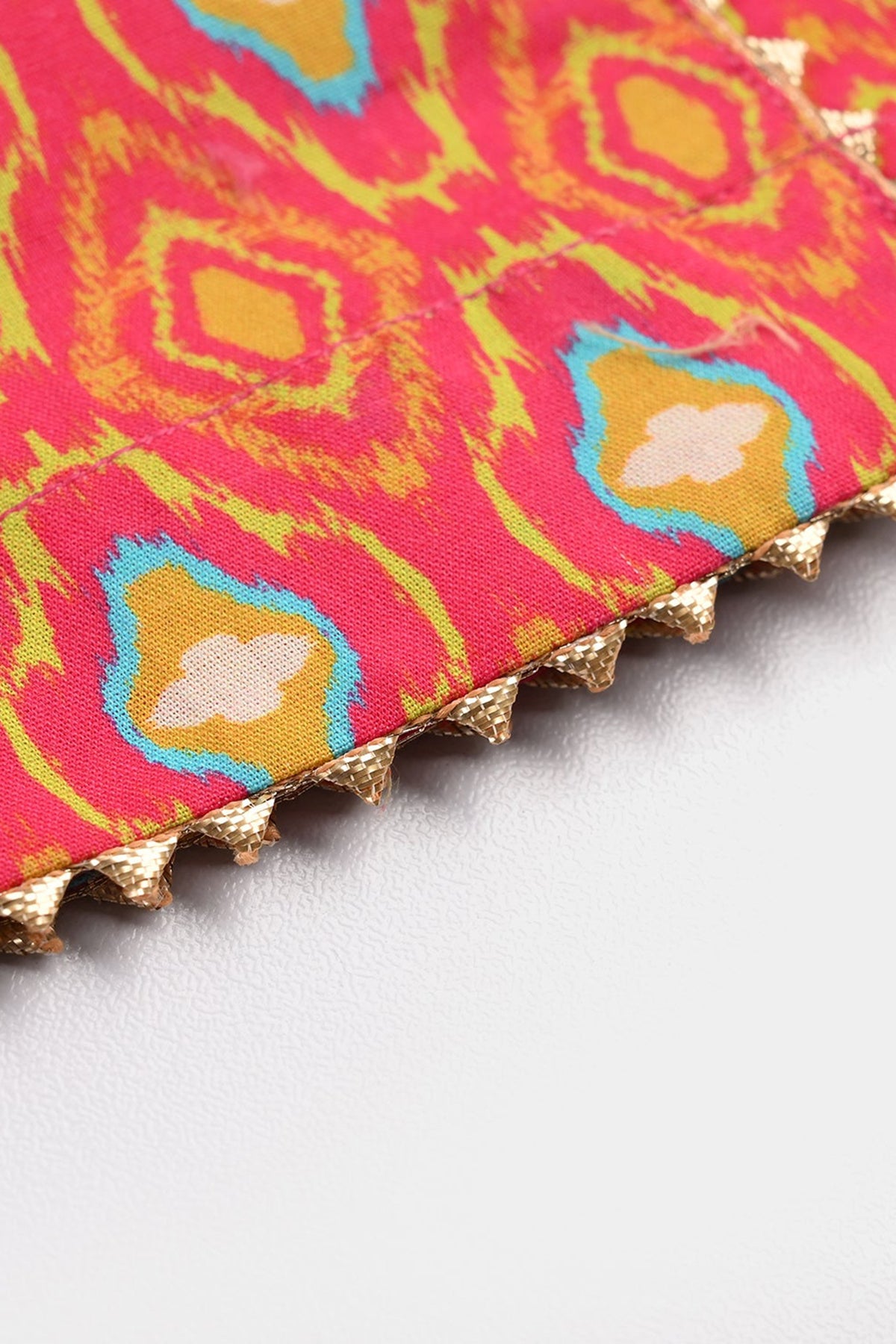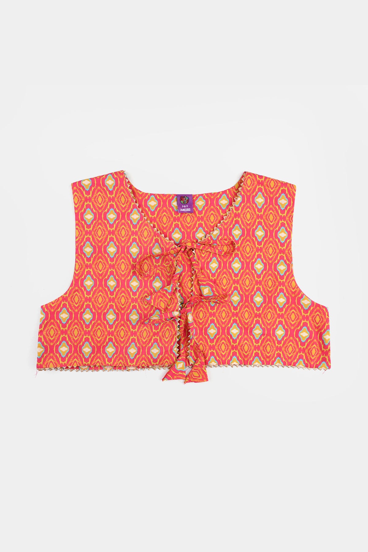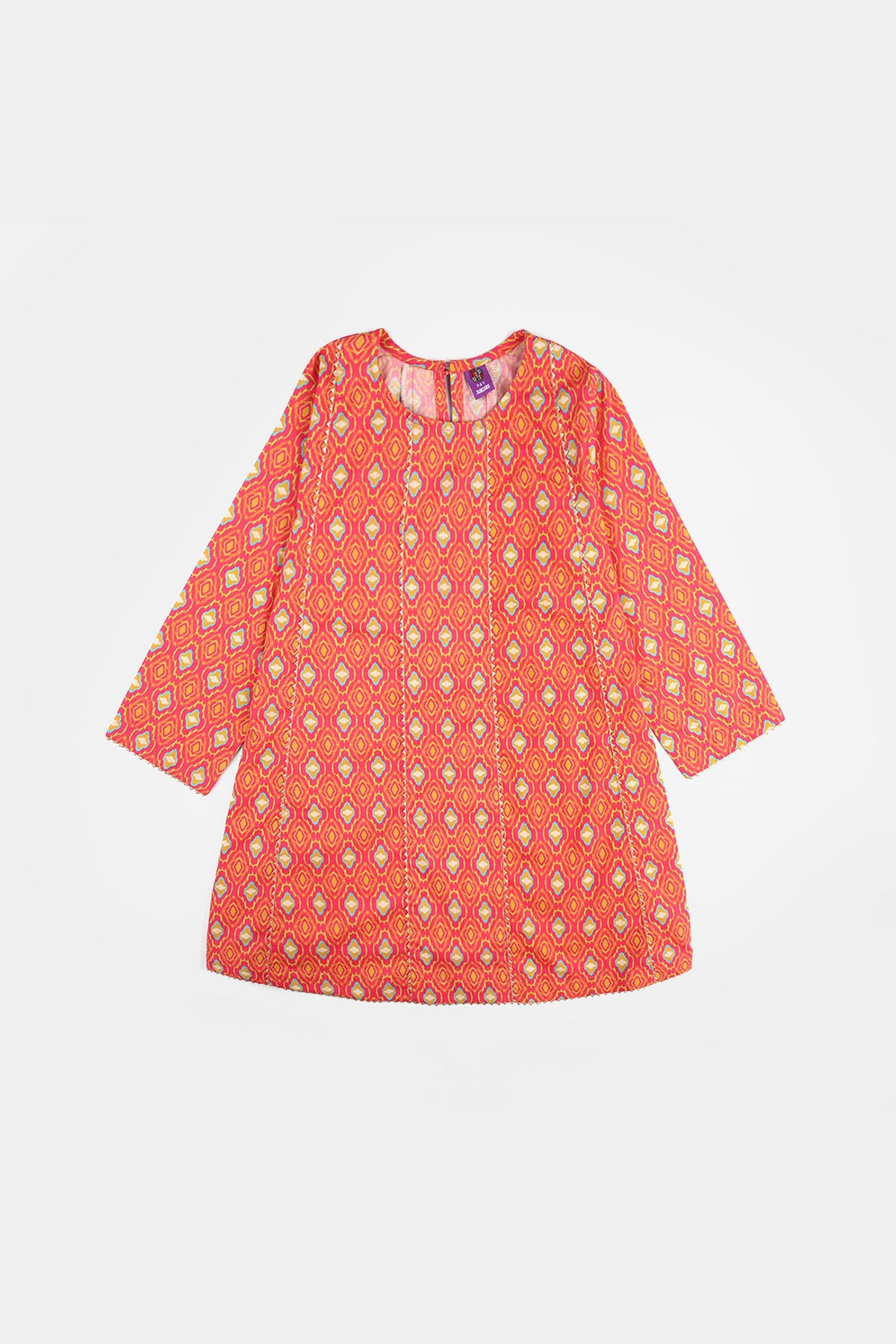 Orange 3-piece girls set featuring a printed shirt with a round neck and full sleeves, matching trousers, and a sleeveless koti for a complete traditional look.