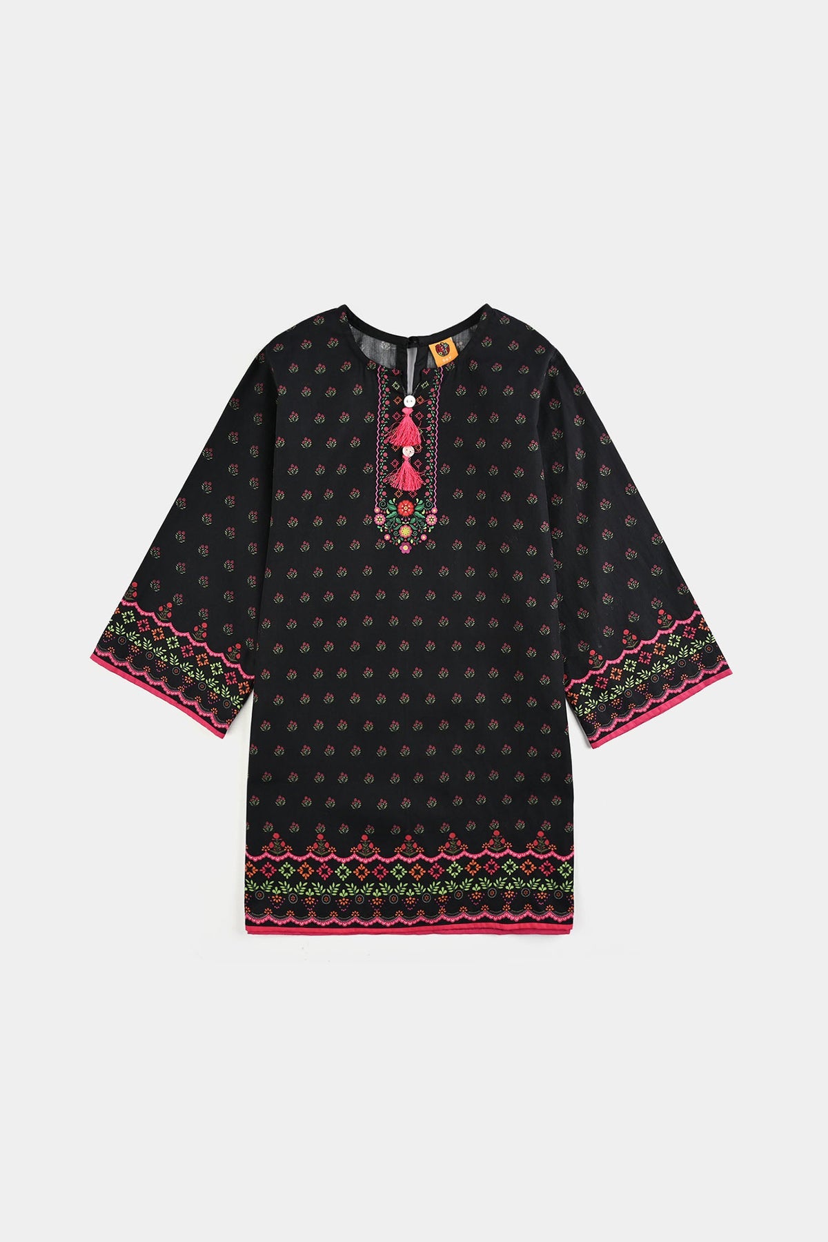 Girls black cotton printed shirt featuring soft, breathable fabric, round neck, playful tassel detail, full sleeves, and straight fit for comfortable everyday wear.