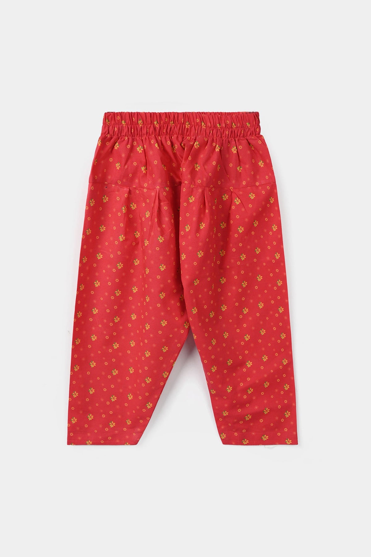 Infant girls’ cotton floral printed shalwar in red, with an elastic waist, perfect with any kurti or top.