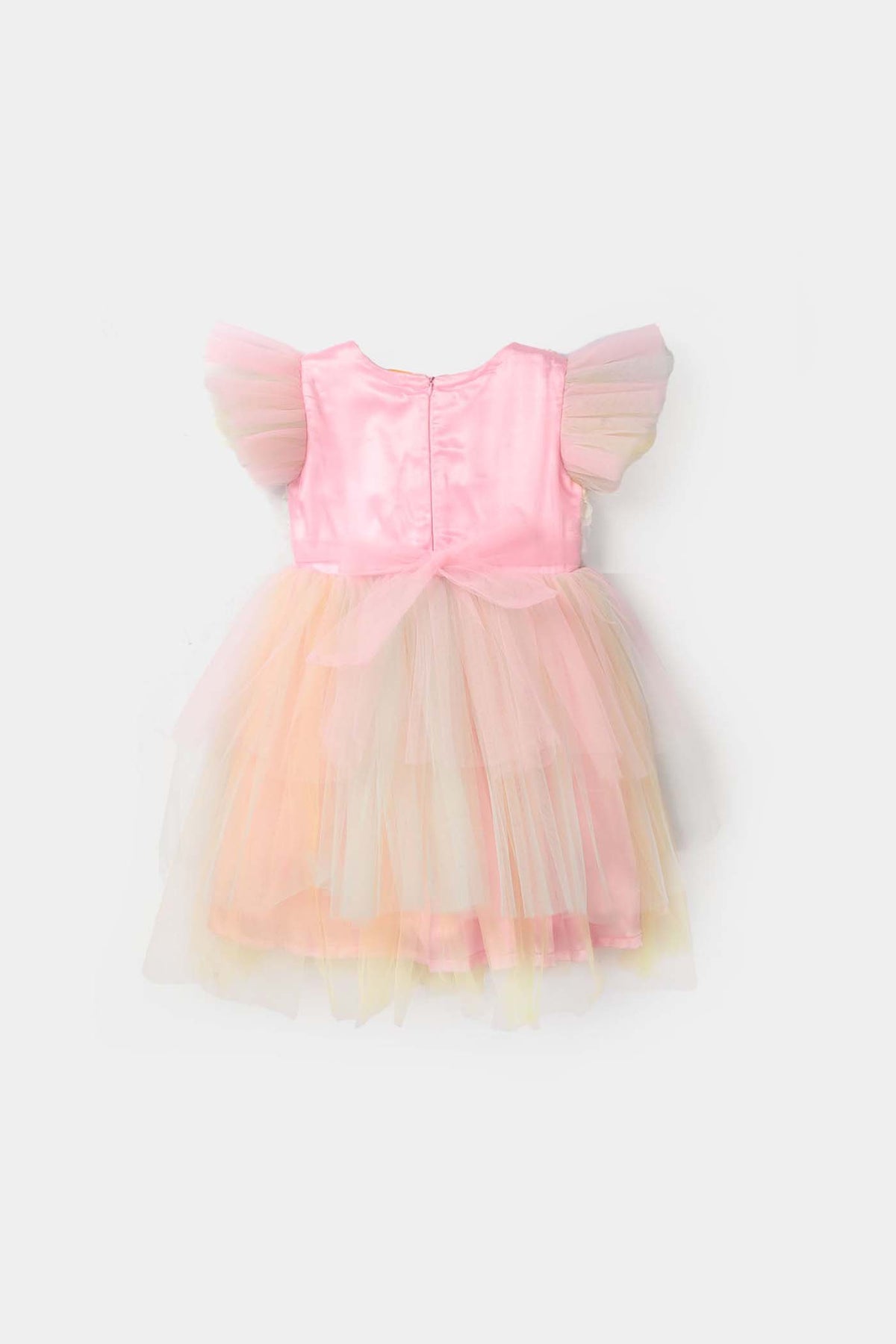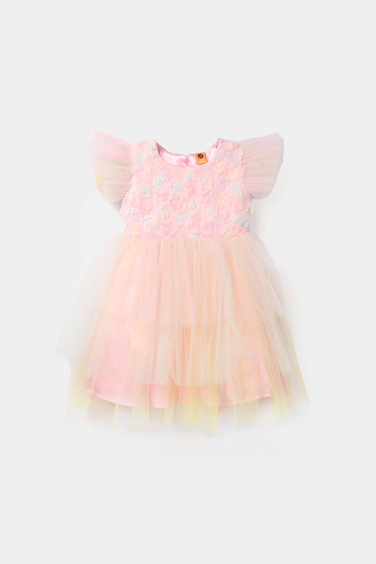 This pink girls frock features a floral embossed effect on the body with ruffled short sleeves, creating an elegant and charming look.