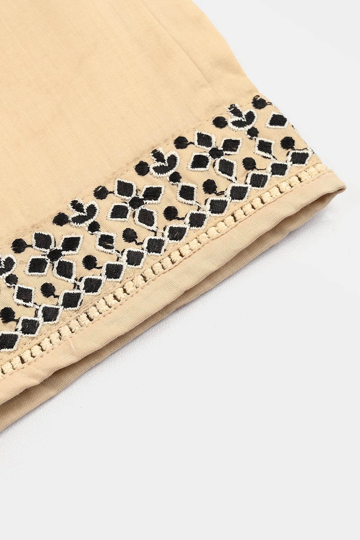 This off-white 2-piece set for girls features embroidered neckline and sleeve borders and panels, paired with matching straight-fit bottoms finished with border detailing.