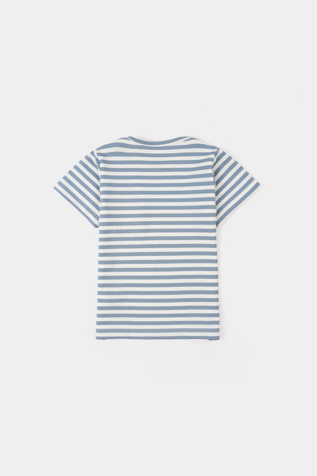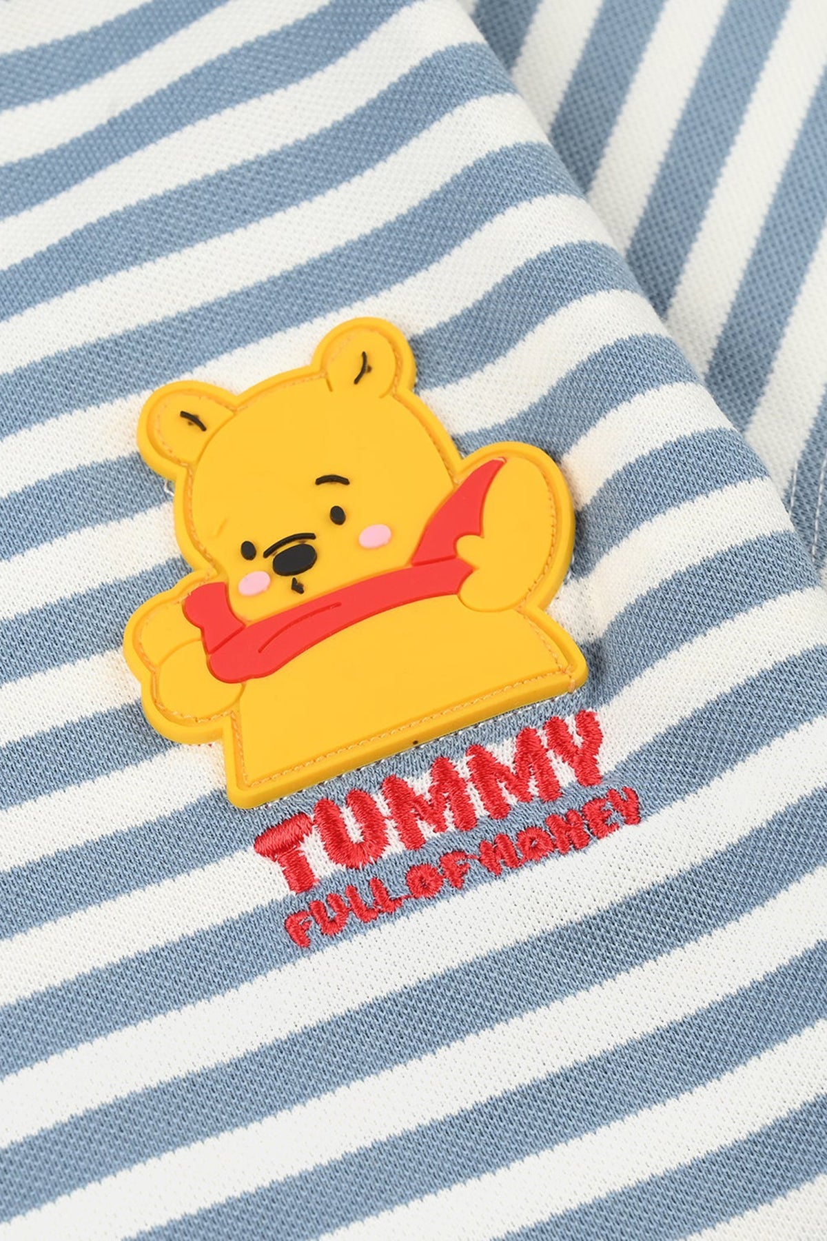 Infant boys’ yarn-dyed round neck T-shirt in blue, featuring “POOH” graphic and striped pattern with a round neck and half sleeves.