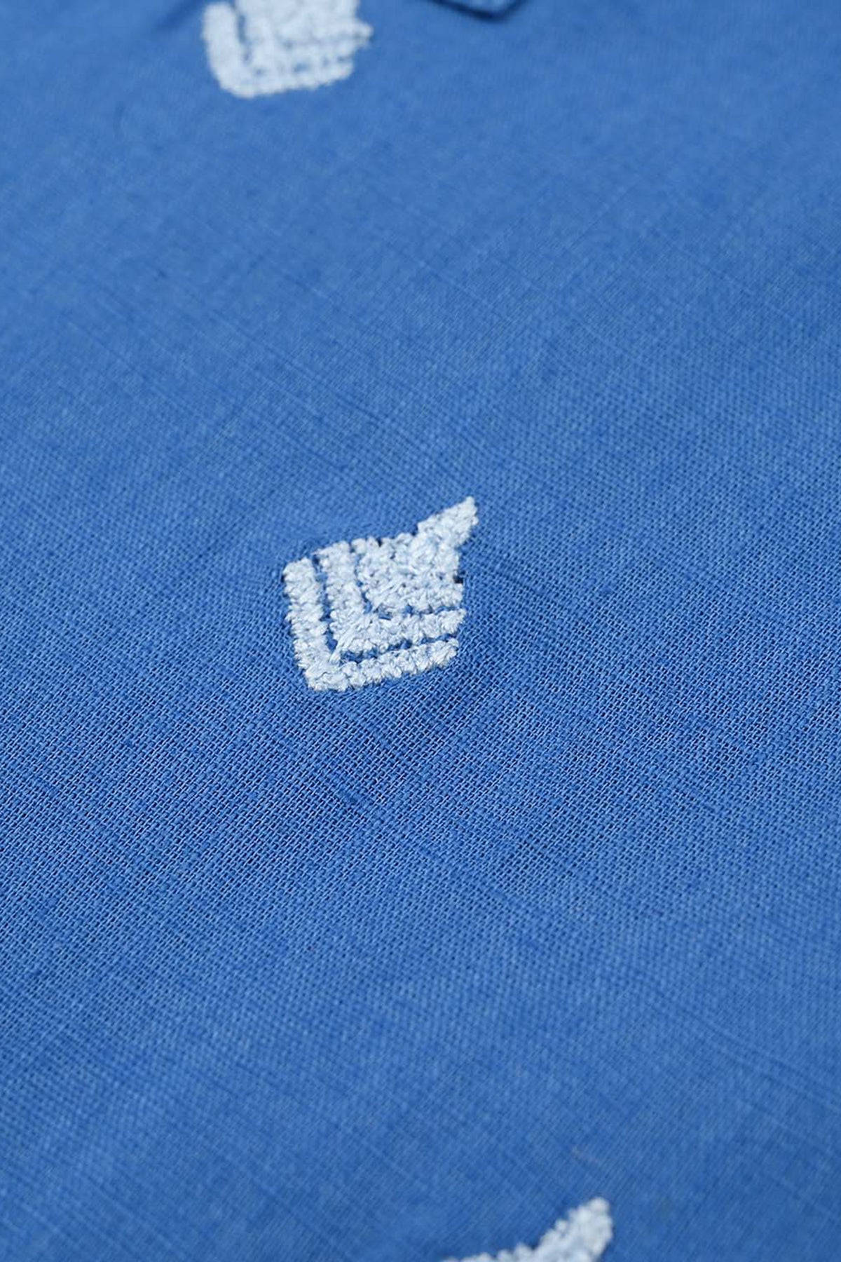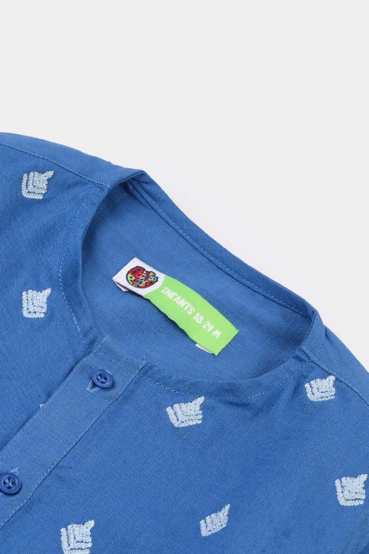Infant boys’ cotton slub embroidered kurta in blue, featuring long sleeves and all-over booti embroidery, perfect with white or matching pajama.