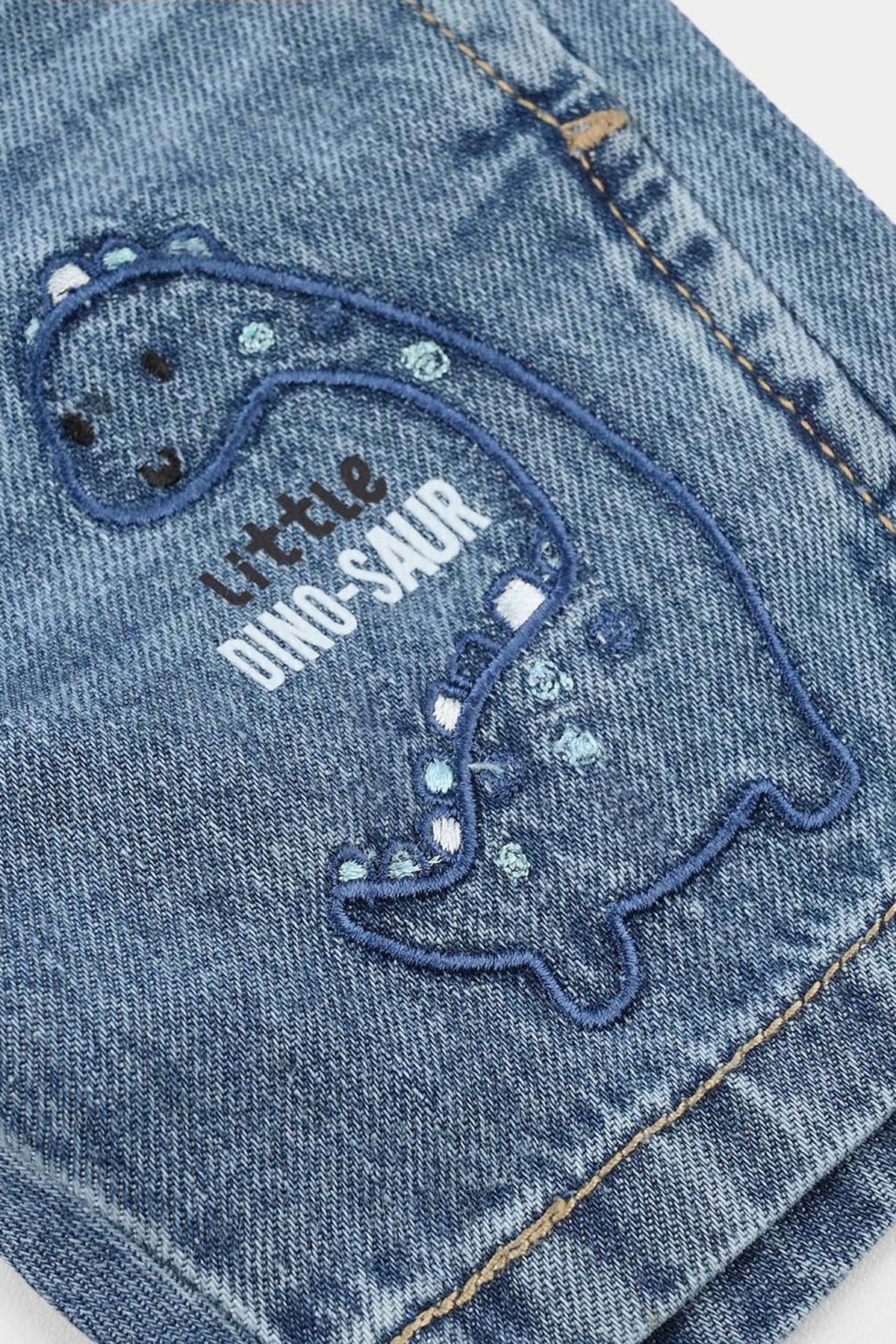 Infant boys’ rigid denim shorts in light blue, featuring a “Little Dinosaur” print and a comfortable fit.