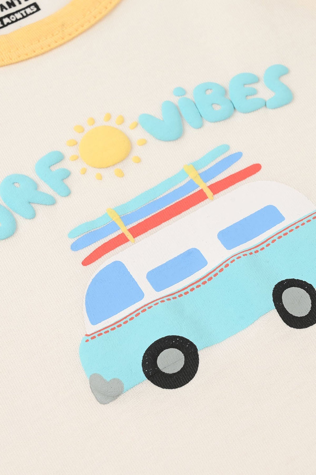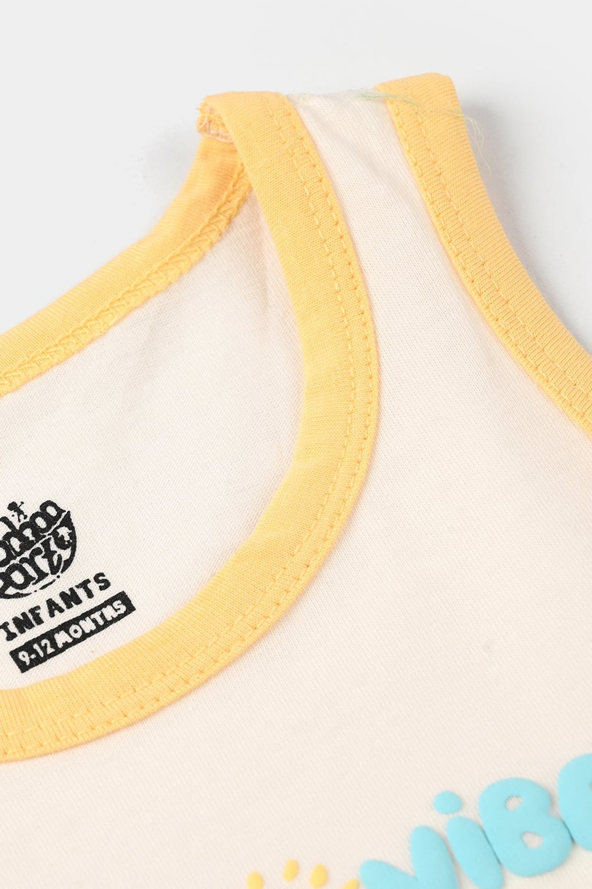 Infant boys’ jersey/terry sando in off-white, featuring a sleeveless design and “Surf Vibes” front print, perfect for casual comfort.