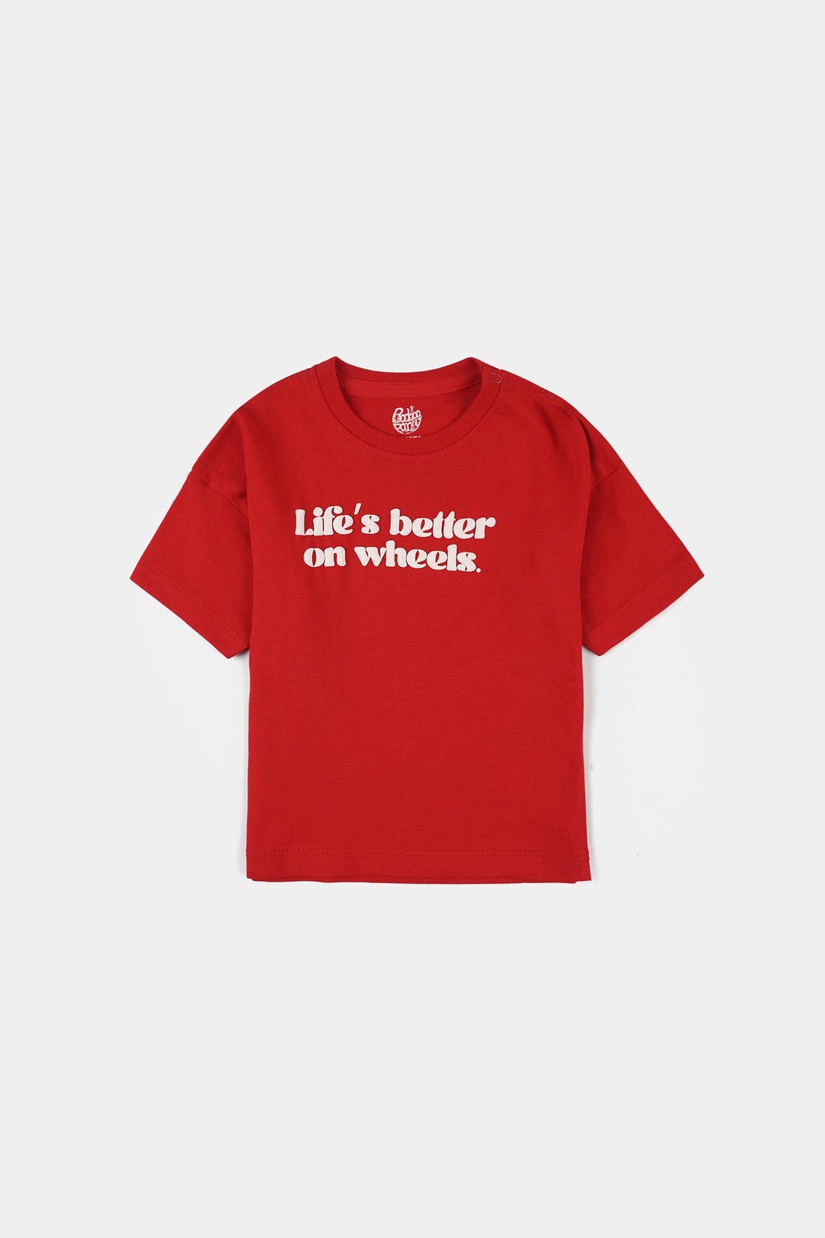 Infant boys’ jersey/terry T-shirt in red, featuring a round neck, half sleeves, and a printed text on front.