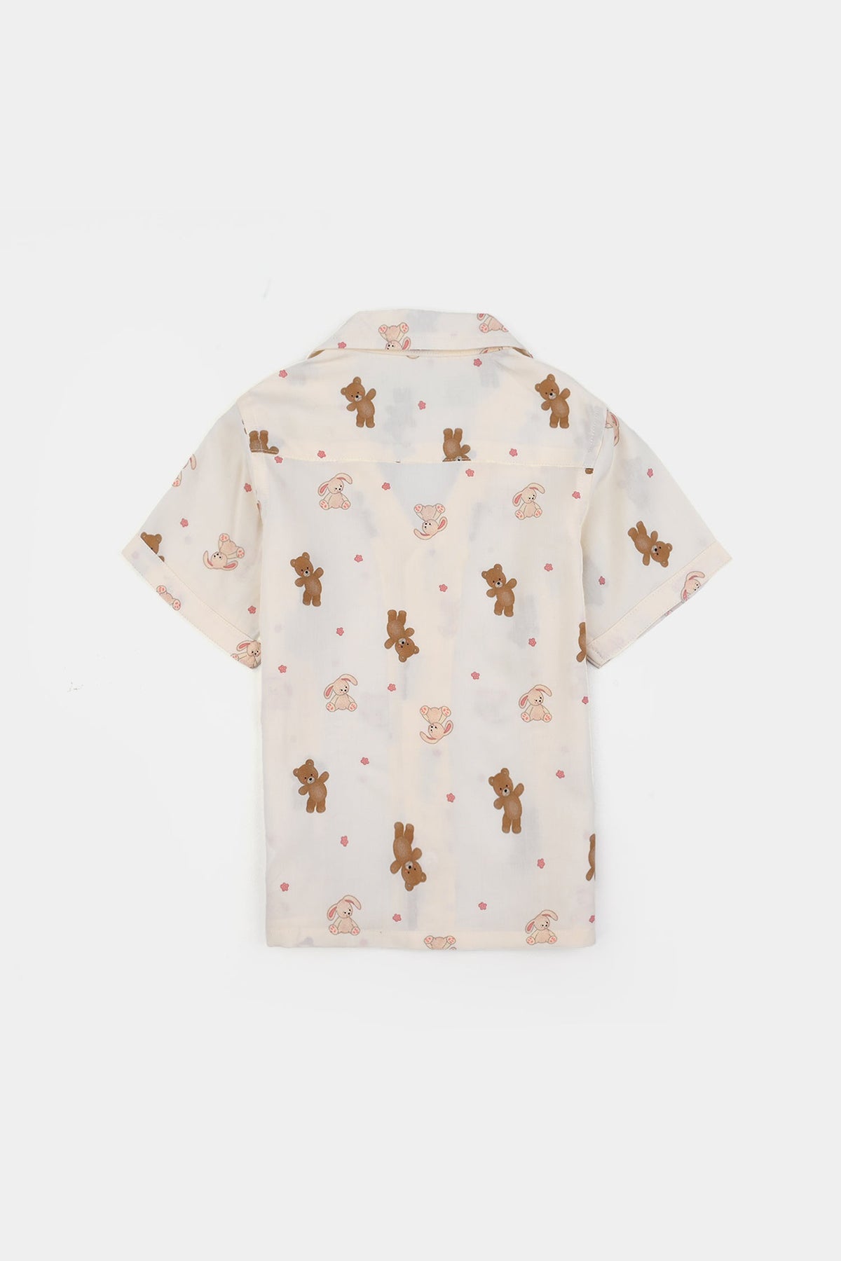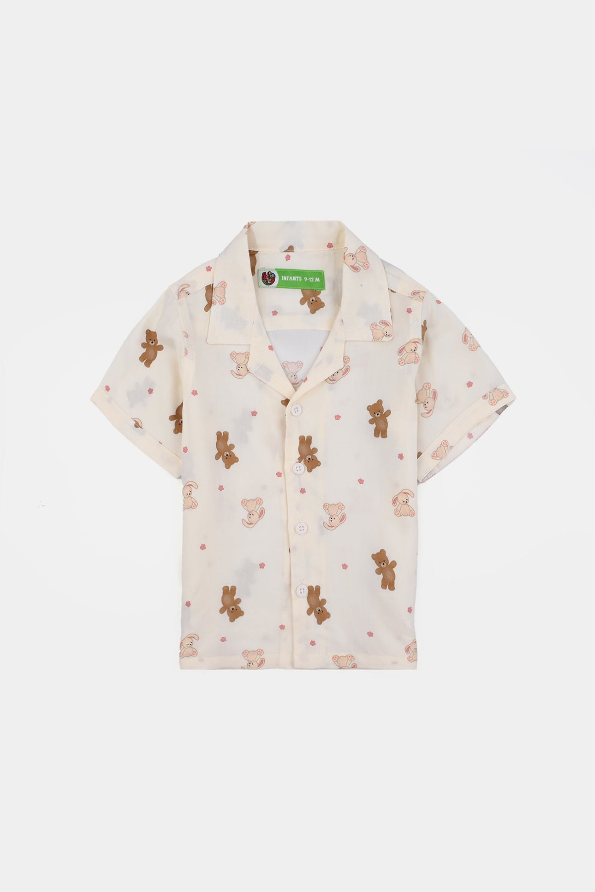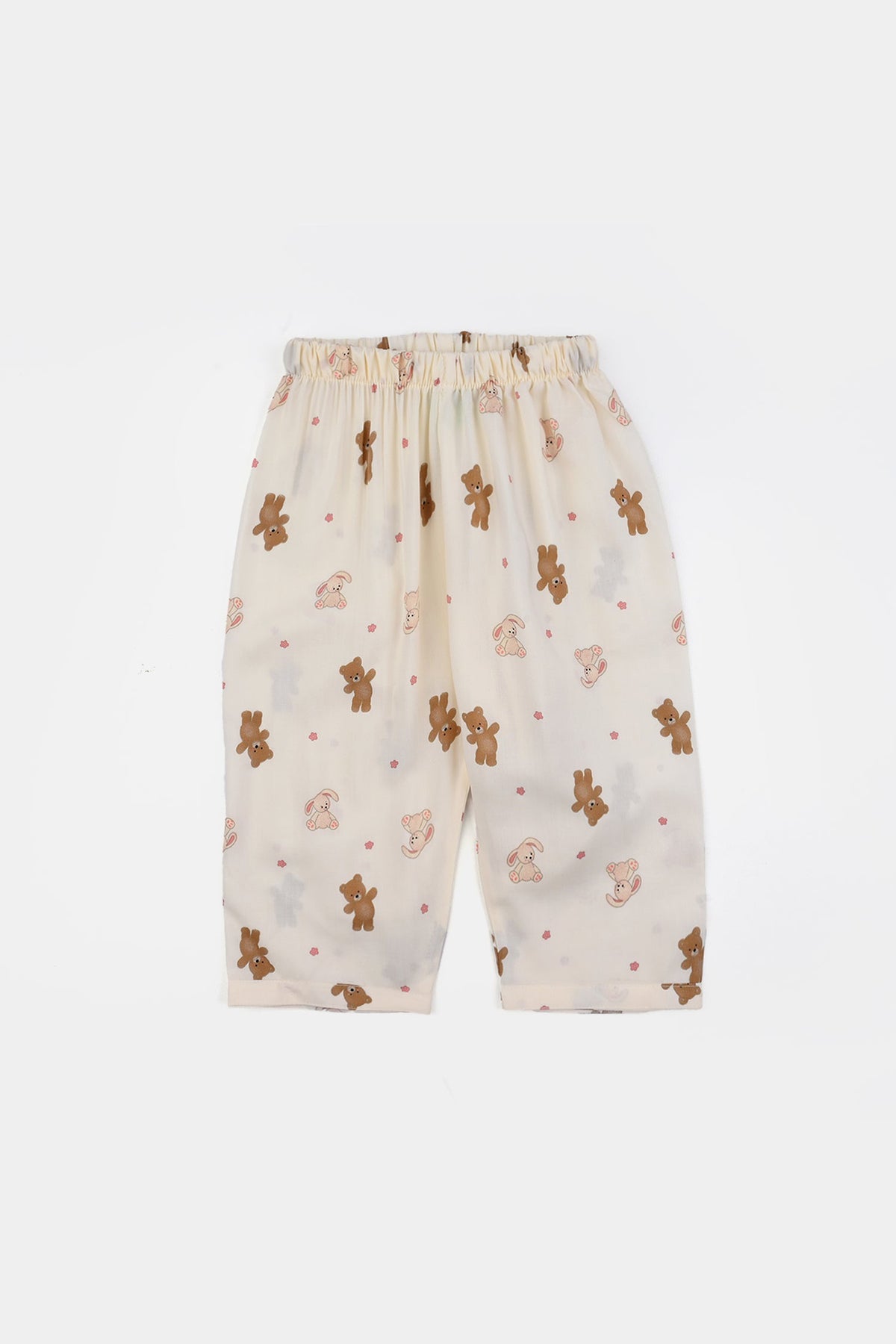 Infant boys viscose night suit in off-white featuring Teddy print, collar, front-open full-sleeve shirt, and matching bottoms for a comfortable sleepwear.