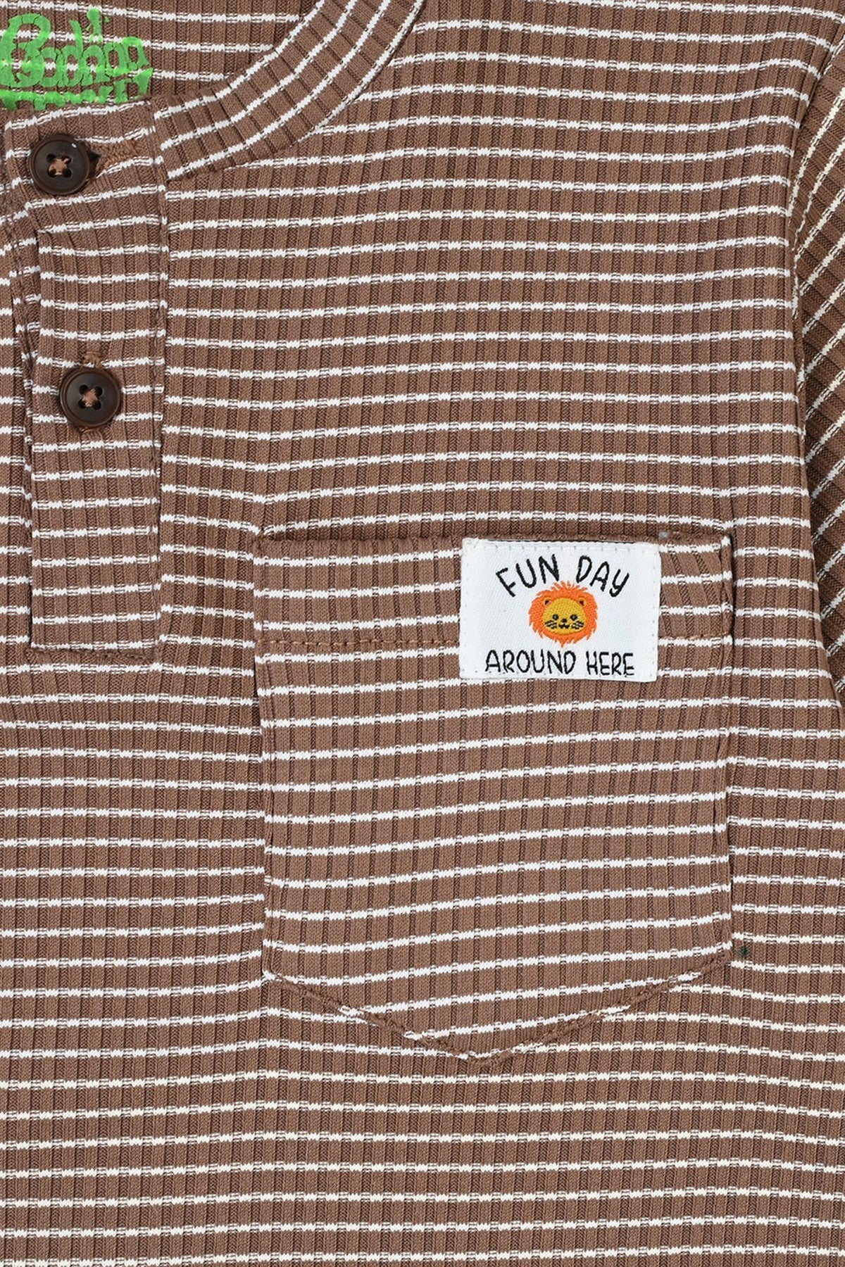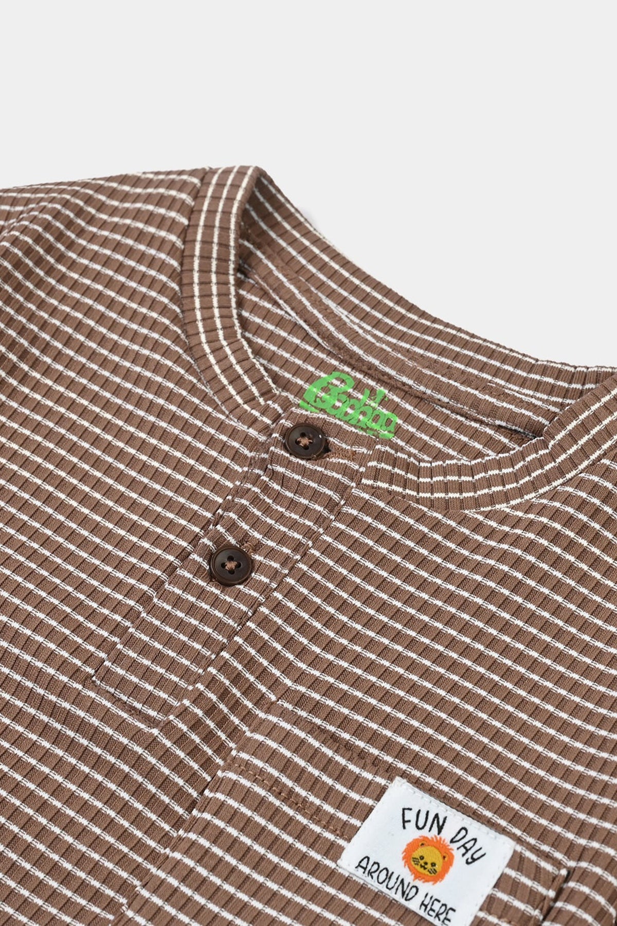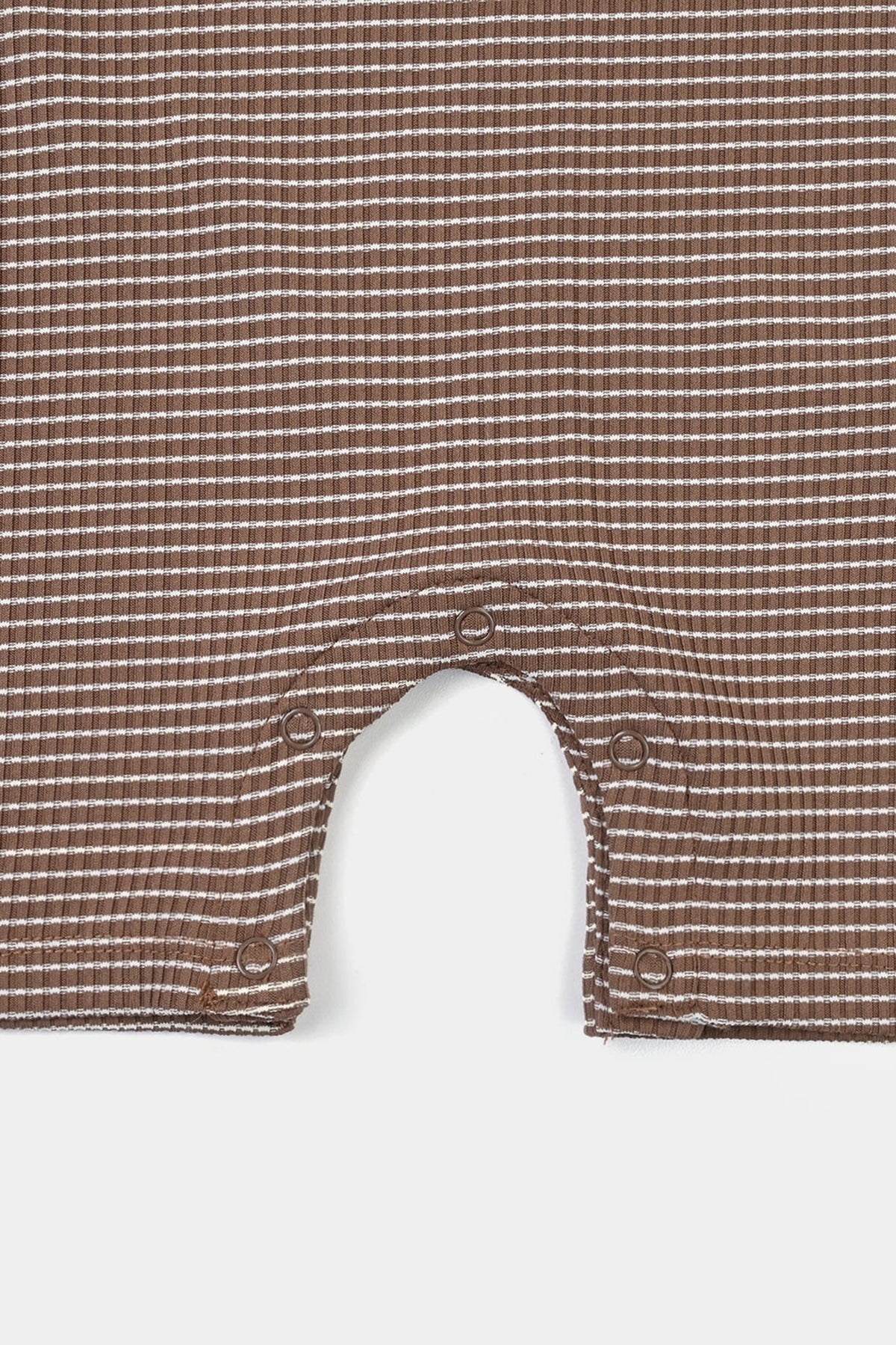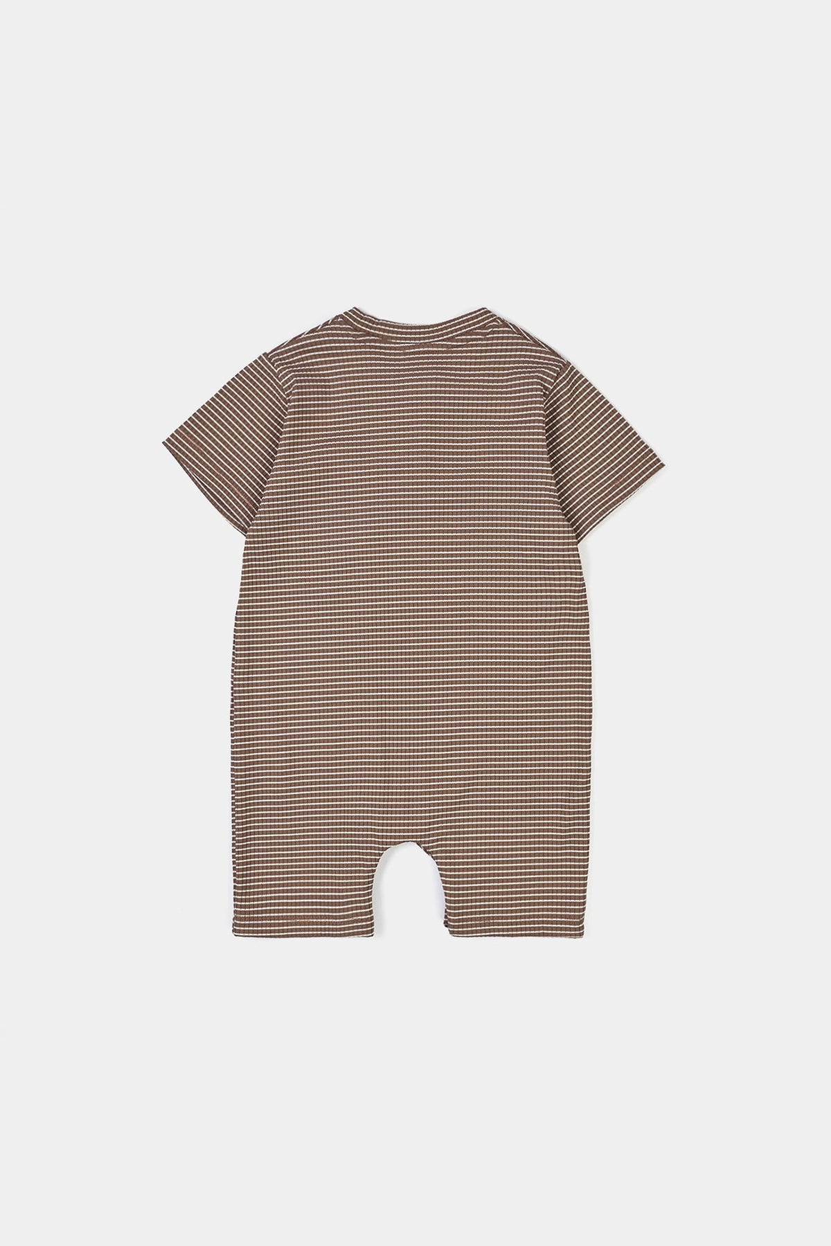 Infant boys’ yarn-dyed knitted romper in brown, featuring a round neck with button opening, half sleeves, front pocket, half-length design, and striped print pattern.