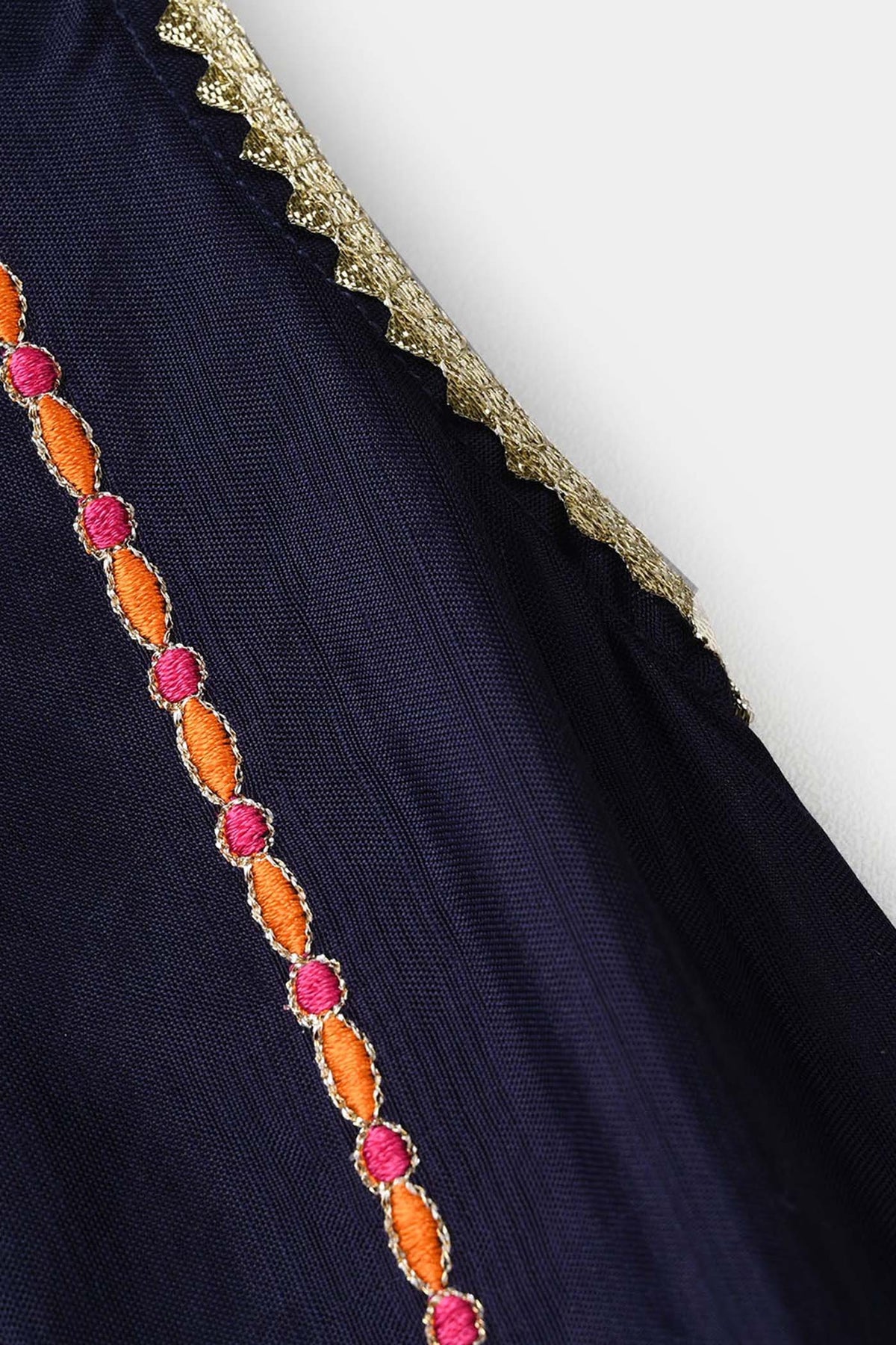 Infant girls 2-piece set in navy blue featuring a sleeveless round-neck shirt with lace and embroidery on the front, paired with matching culottes adorned with lace detailing for a coordinated look.