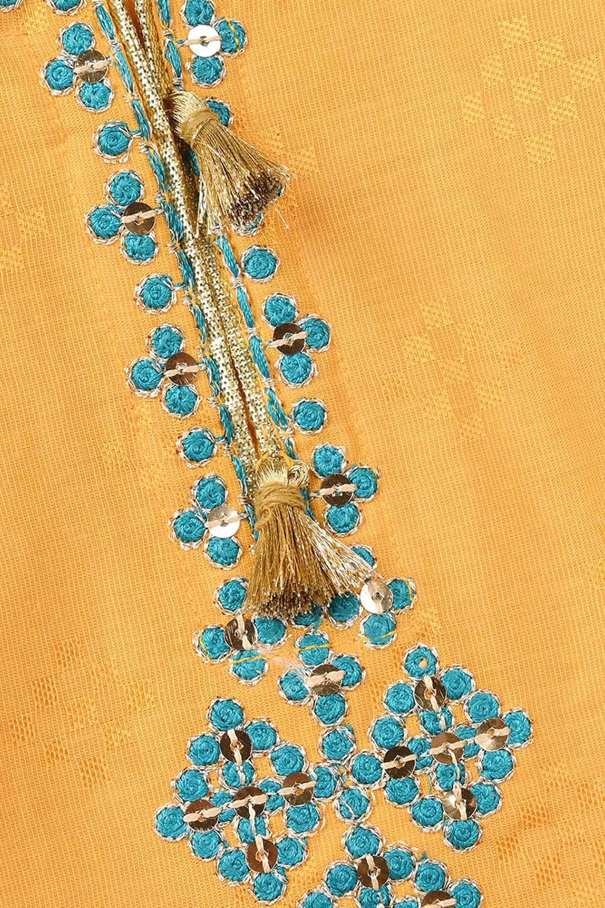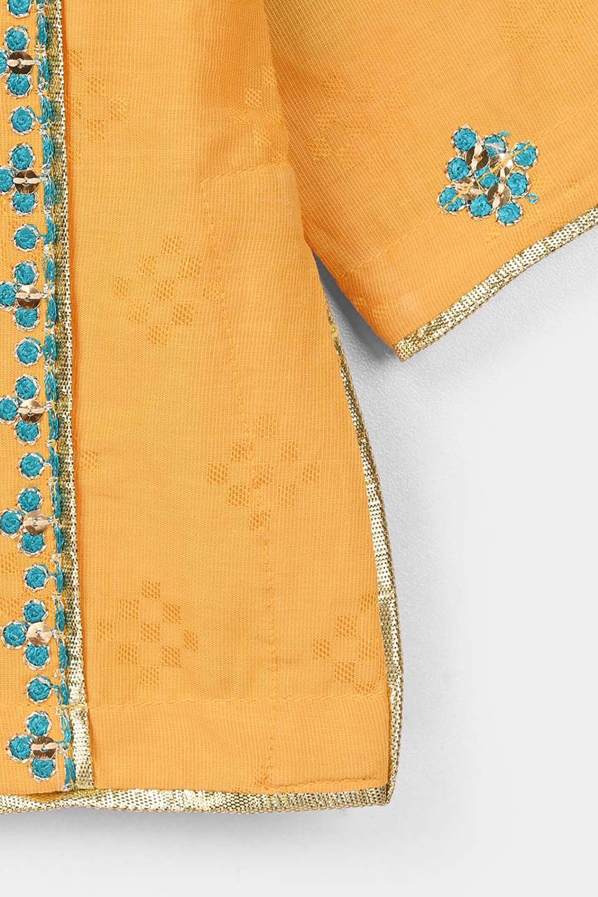 Infant girls' 3-piece set Ishq in yellow features full sleeves, a straight-fit kurti, embroidered culottes, and a contrast green dupatta for a complete festive look.