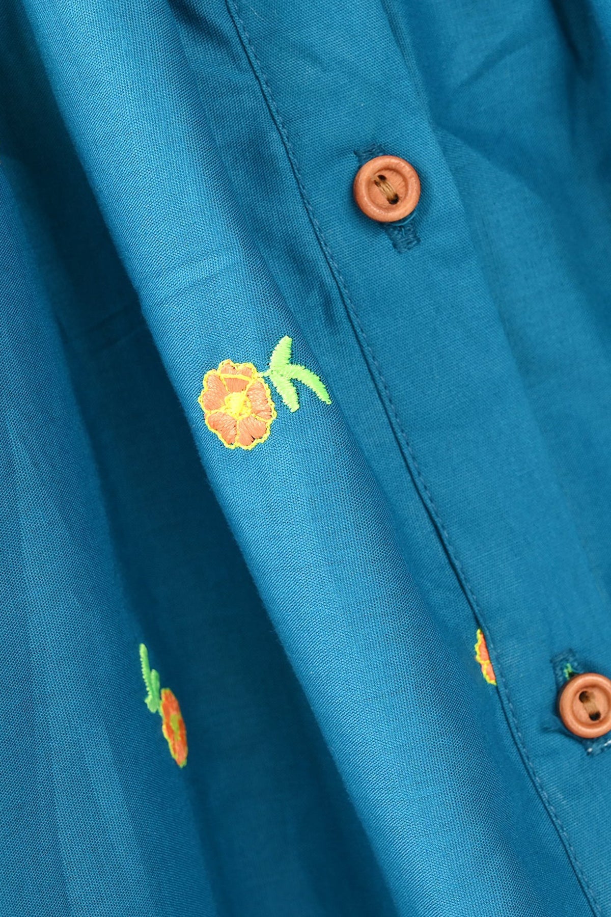 Infant girls’ cotton embroidered 2-piece set in royal blue and turquoise, featuring a round neck, front-open sleeveless kurti, and matching bottoms with pockets and elastic hem.
