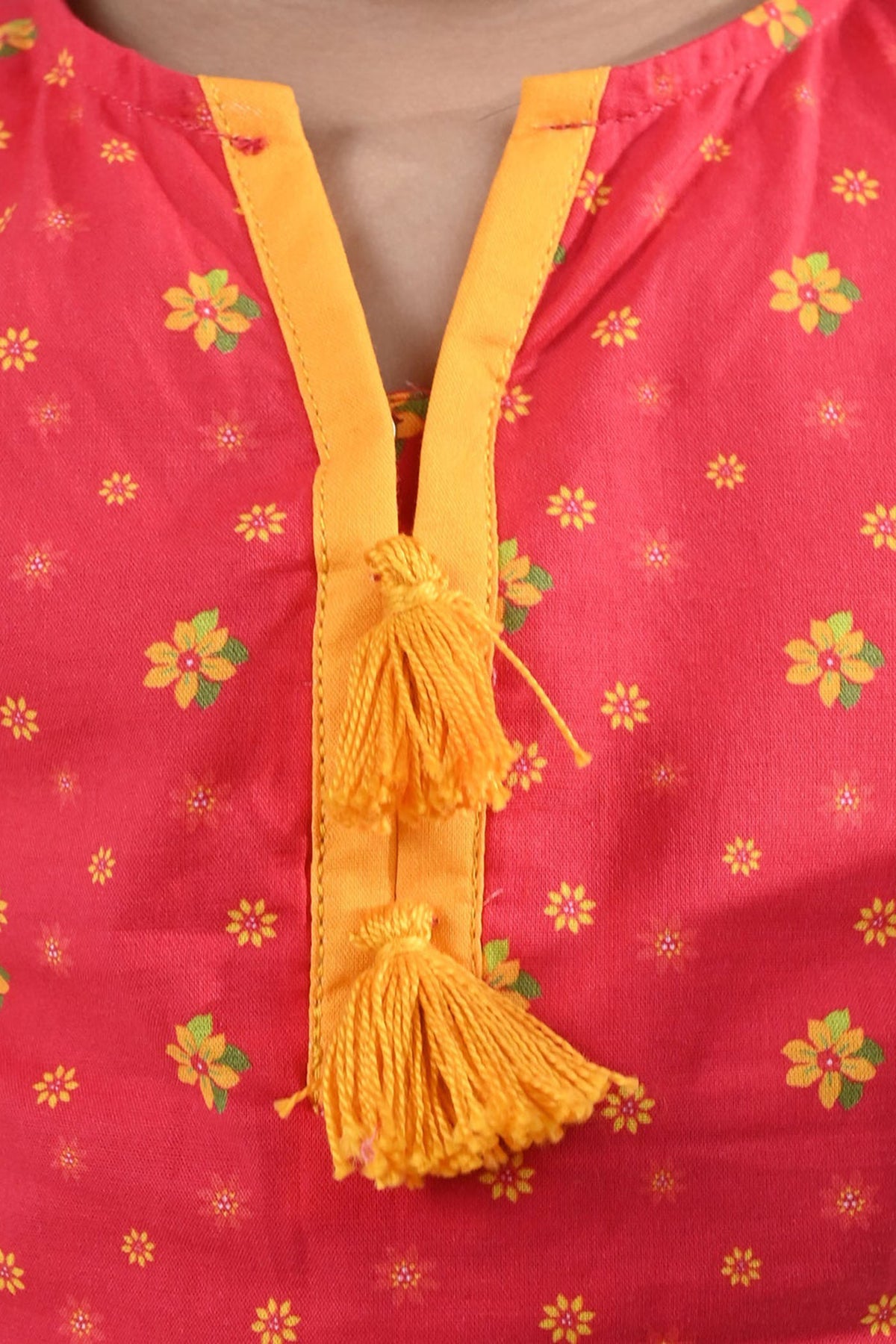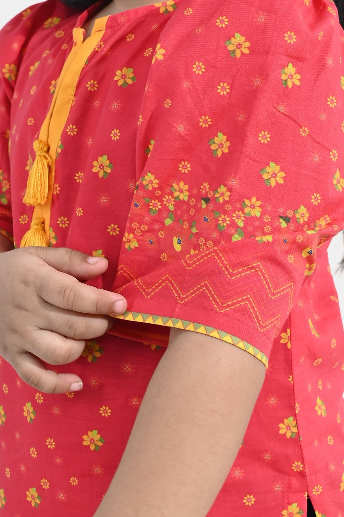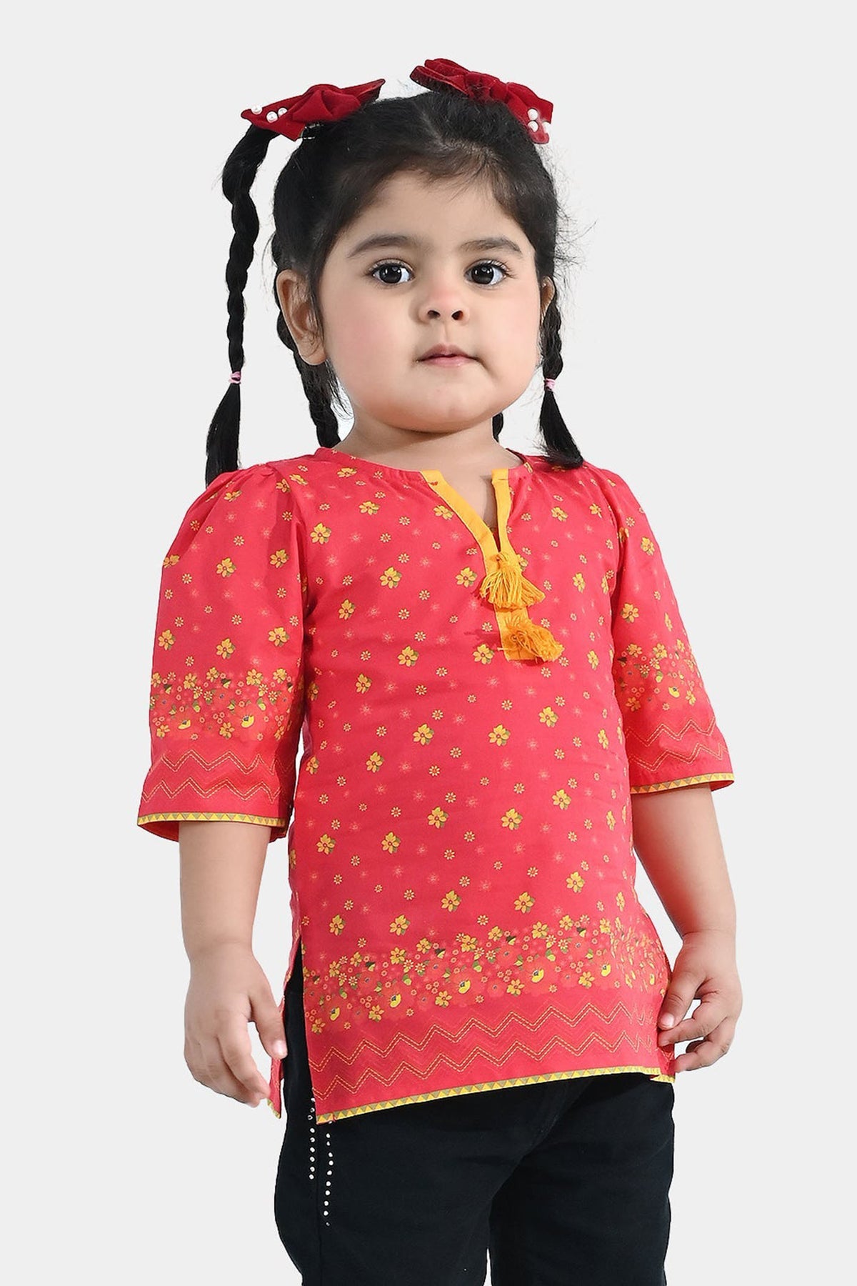 Infant girls’ cotton printed kurti in red, featuring tassel neck detailing, quarter sleeves, and a comfortable fit, perfect with shalwar, jeans, or tights.