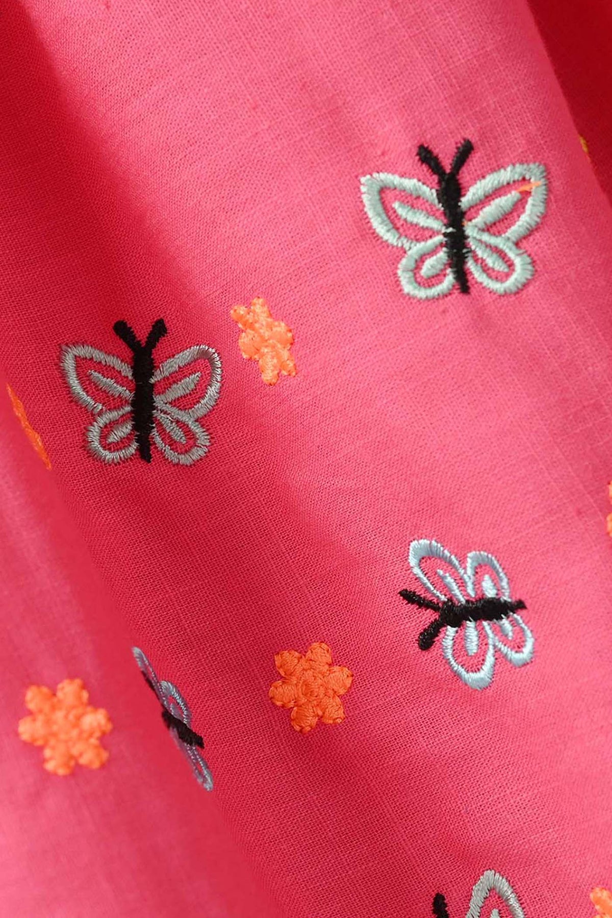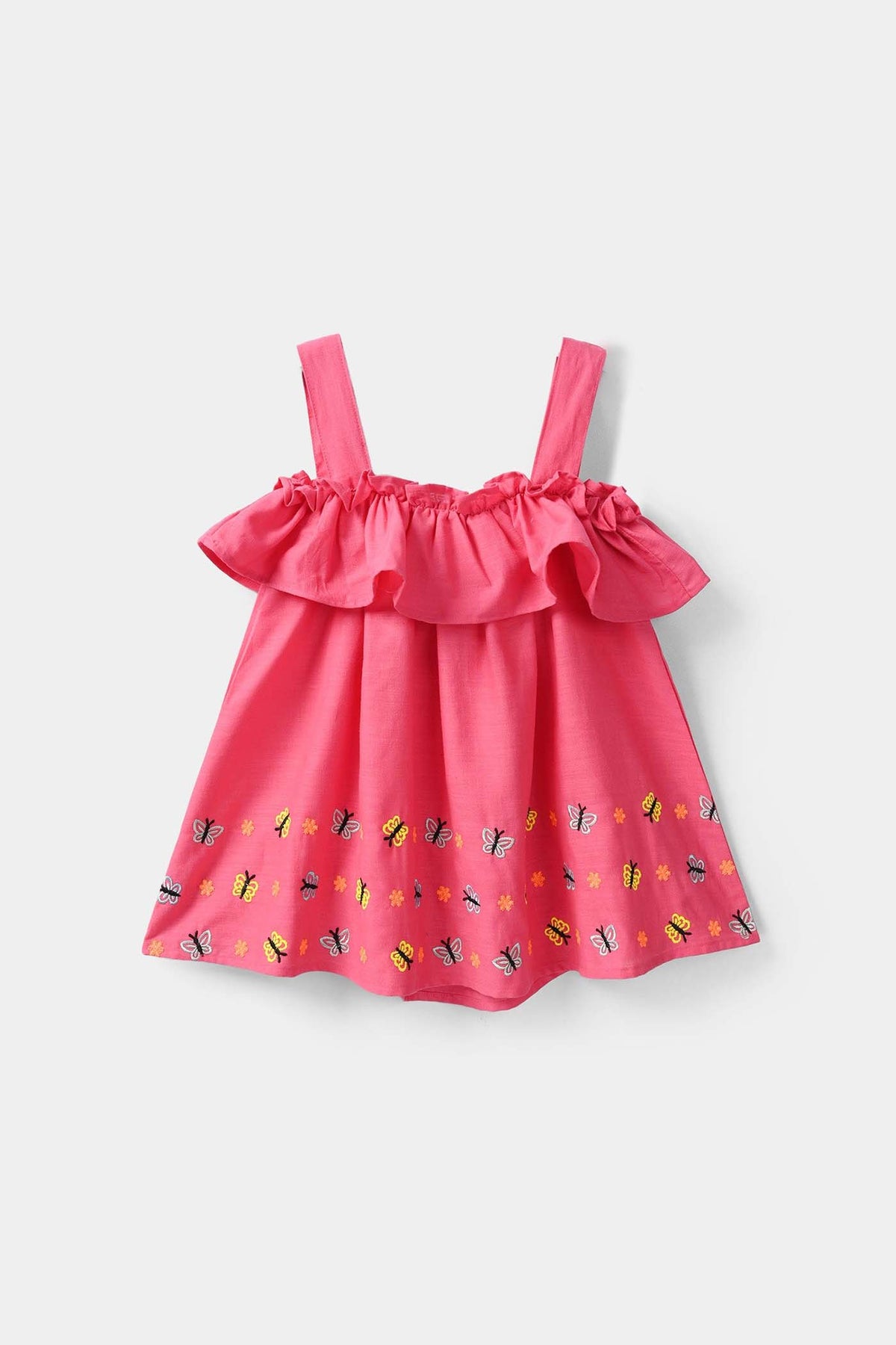 Infant girls’ cotton slub embroidered kurti in rose pink, featuring a striped shoulder design, frill detailing, butterfly embroidery, and a frock-style fit, perfect to pair with jeans/shorts or any bottom.