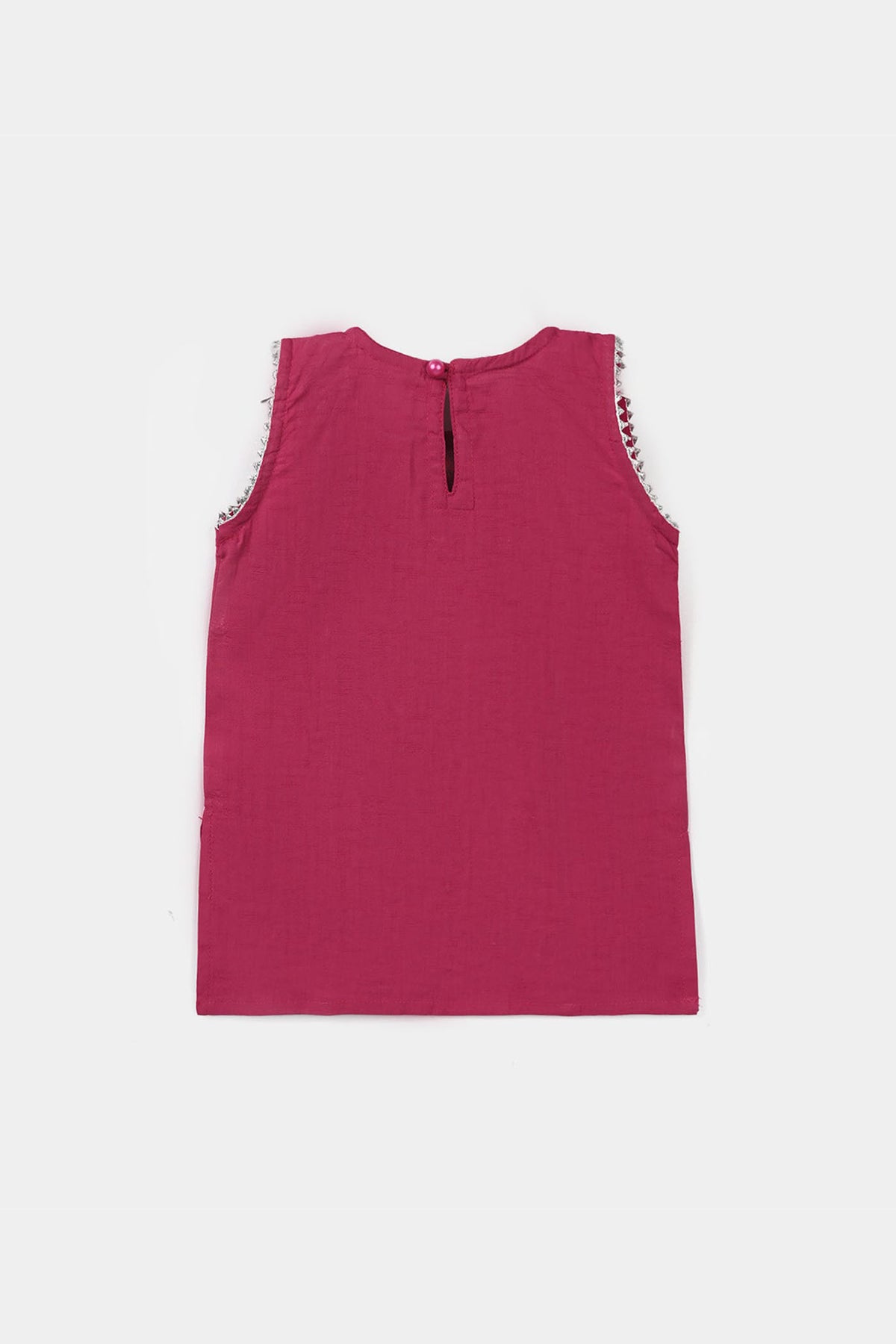 Girls' sleeveless kurti in magenta features a round neck, straight fit, jacquard fabric, and lace detailing for a stylish everyday look.