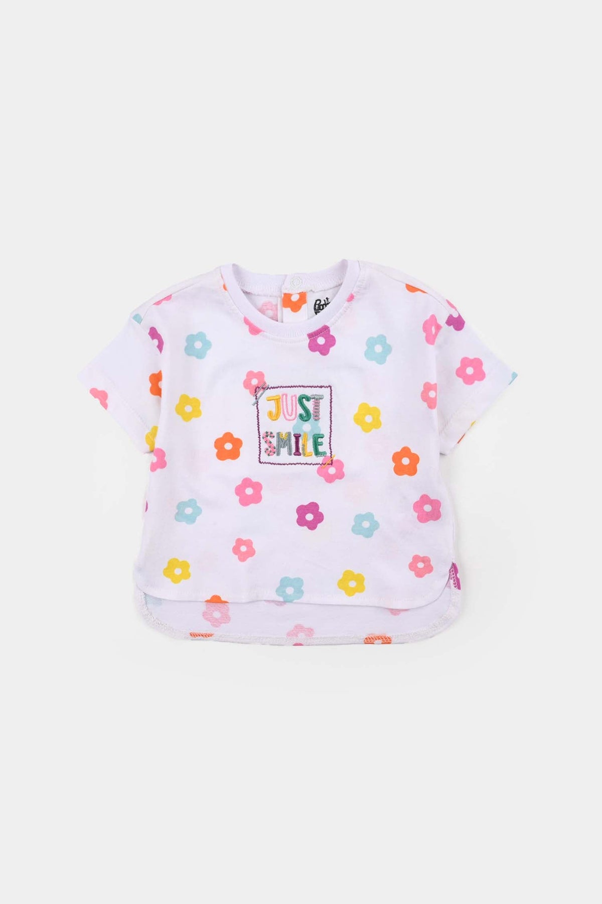 Infant girls’ jersey/terry T-shirt with a round neck and half sleeves, featuring an all-over floral print, “Just Smile” embroidered text, and rounded hems.