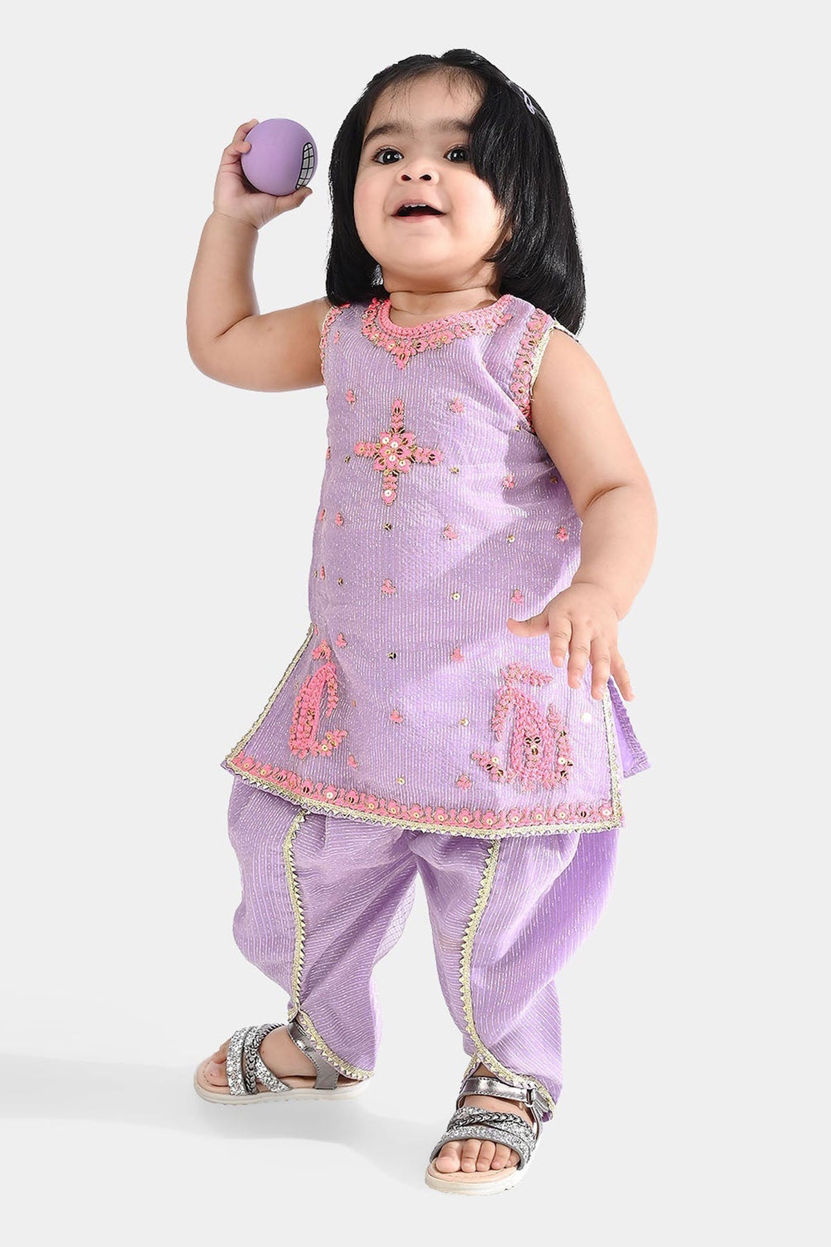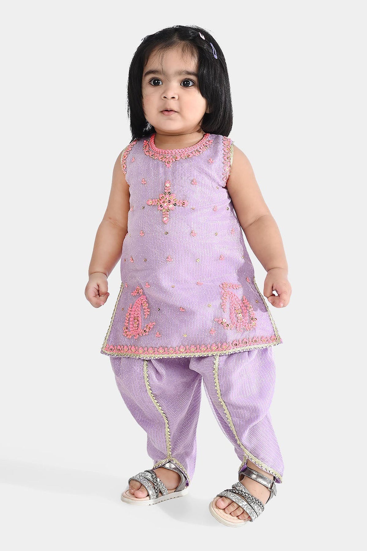 Infant girls’ lilac fancy net 2-piece set features a sleeveless, round-neck embroidered top paired with tulip pants adorned with lace detailing.