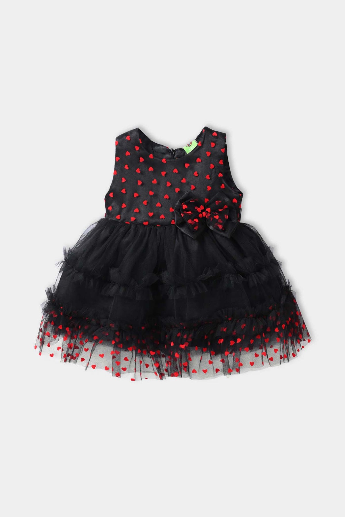This black net infant girls frock features red heart embroidery and a bow on the front and can be paired with panties or tights for a complete look.