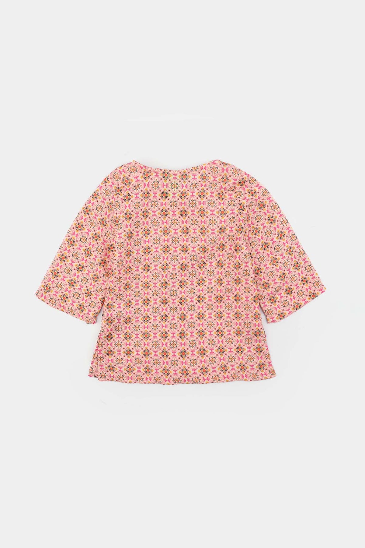 Pink/peach poly mesh printed suit featuring a kameez with tassel detailing and straight full sleeves, paired with a matching shalwar.