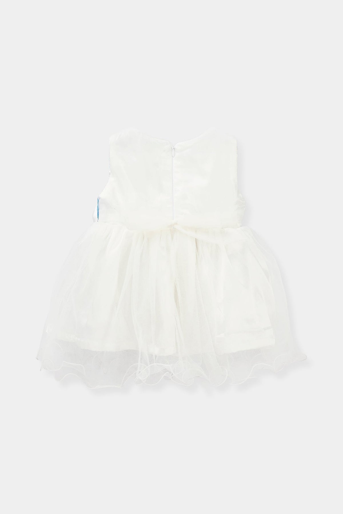 Infant girls’ fancy frock in dreamy blue, featuring sequin detailing, a bow embellishment, and a sleeveless design.