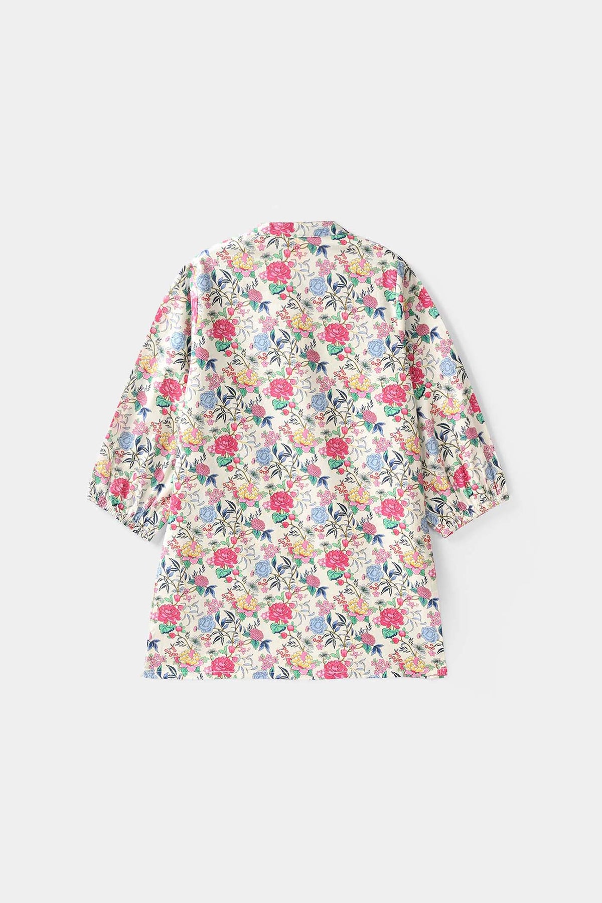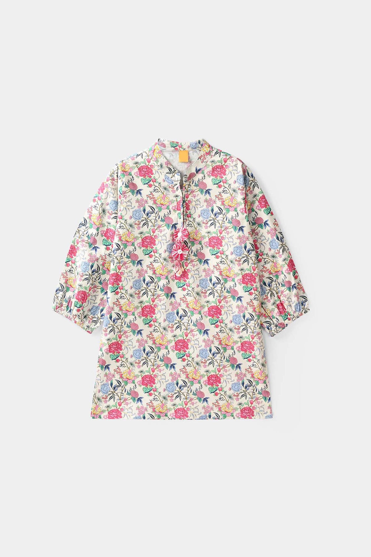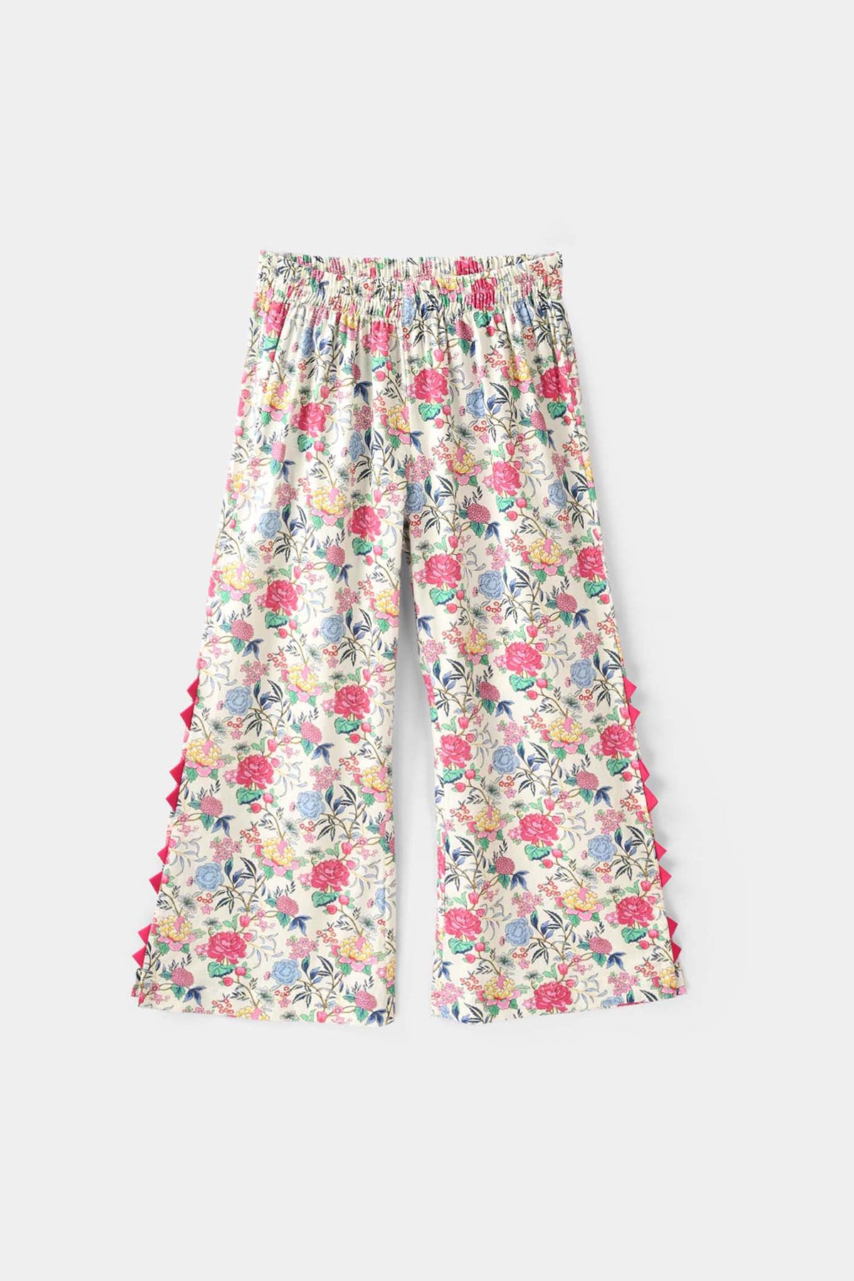 Girls 2-piece set featuring a floral print top with a sherwani collar, full sleeves with elastic ends, and matching loose wide-leg bottoms for everyday comfort.