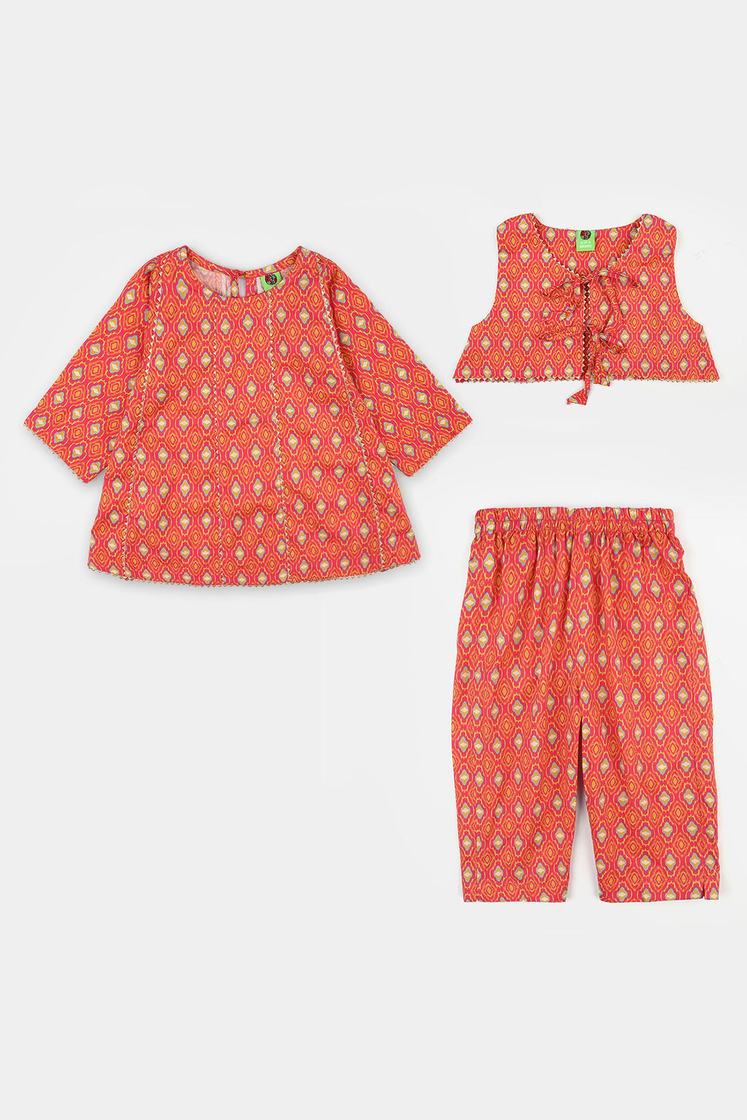Infant Girls Cotton Printed 3Pcs Pink Koti - Multi